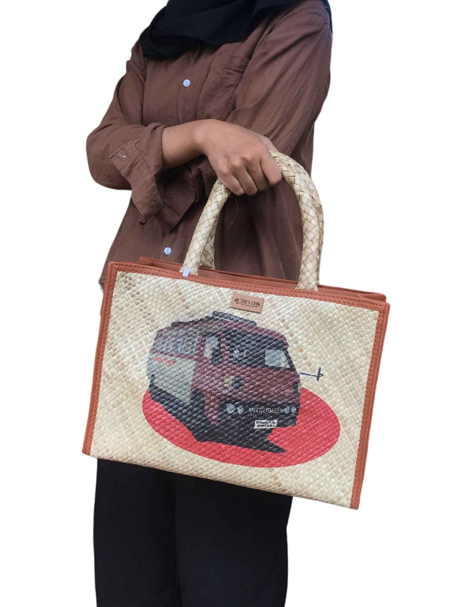 This bag is the result of a decoupage creation with a unique motif that comes from patterned tissue on woven pandanus media. Our innovation in this bag is to use tissue with the motif of Bangka Belitung's local wisdom, namely Pownis local transportation. This bag has a large size with a zipper. Stock is available and can be ordered in large quantities with a PO system. And also can be costum for the motif.