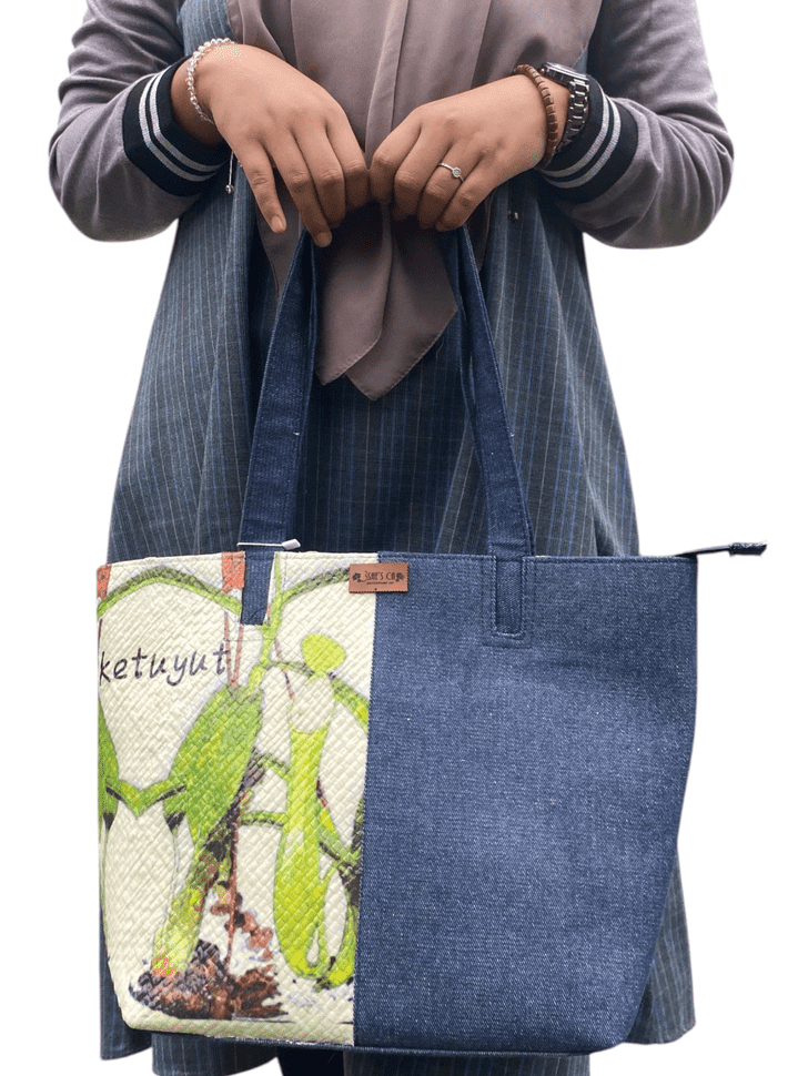 This bag is the result of a decoupage creation, uniquely featuring patterned tissue applied on a woven pandanus base combined with denim. Our innovation in this bag lies in the use of tissue with a motif inspired by the local wisdom of Bangka Belitung, namely ketuyut. Ketuyut is a plant native to Bangka Belitung, commonly known as the pitcher plant. The bag is large in size and comes with a zipper. Stock is available and it can be ordered in large quantities through a pre-order system. Custom motifs are also available upon request.