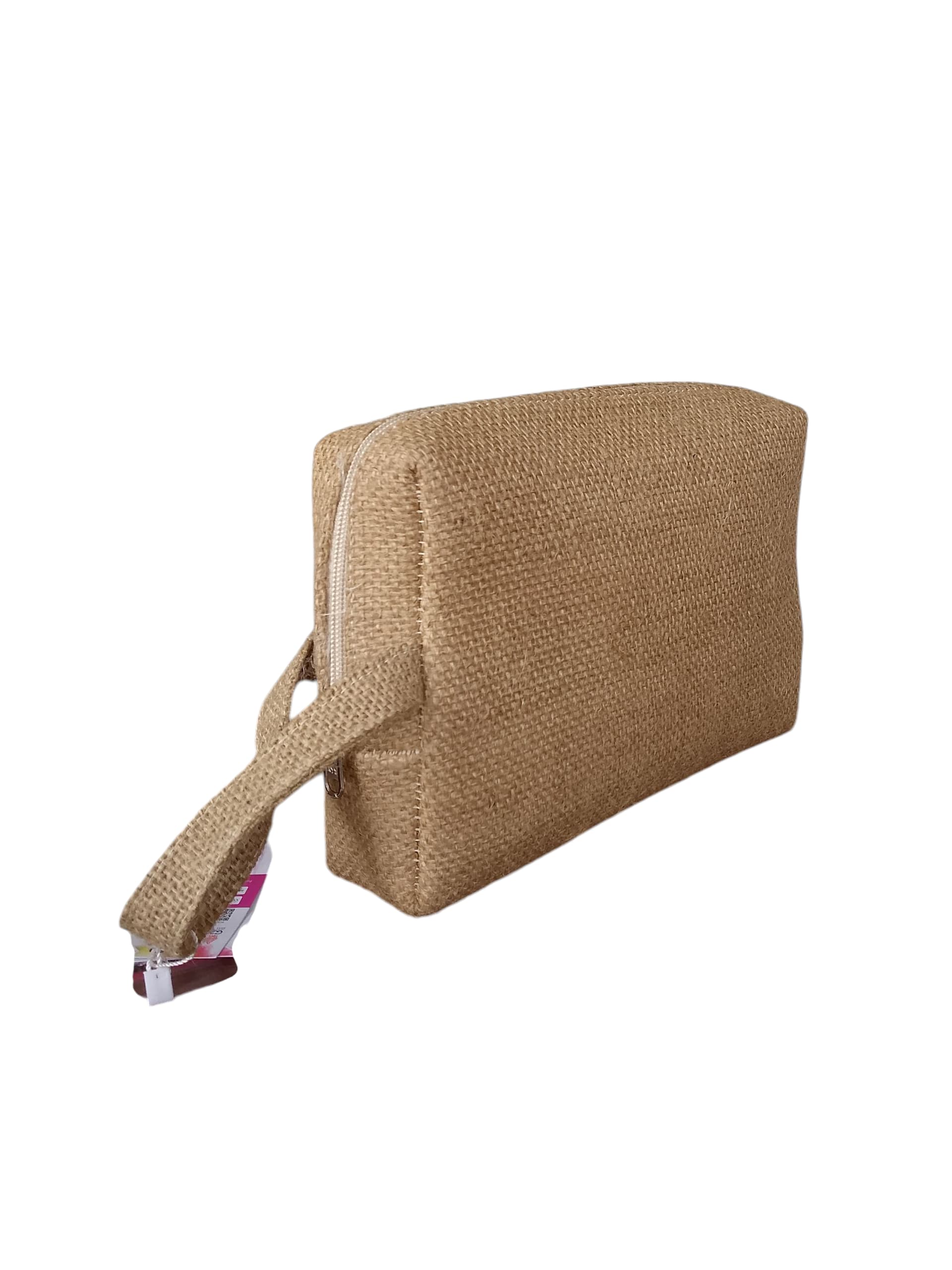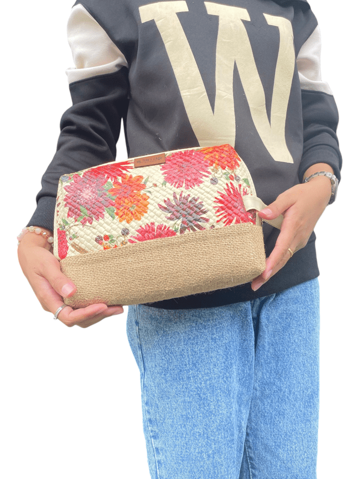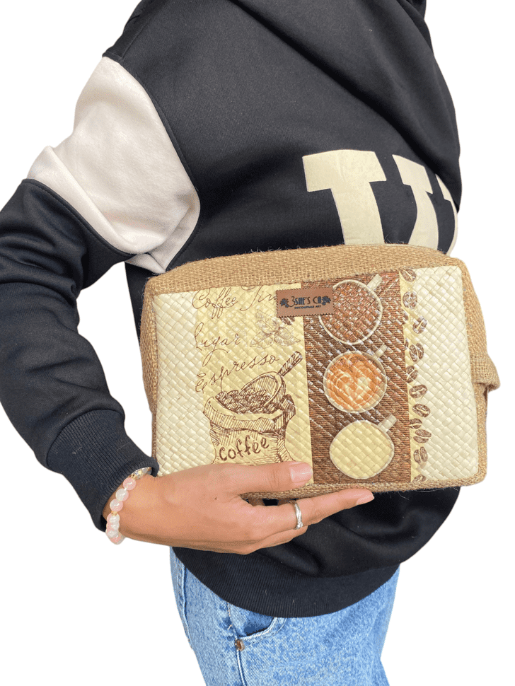 This unique pouch is a decoupage creation, featuring a distinctive motif sourced from patterned tissue applied onto a woven pandan base combined with jute (goni) material.