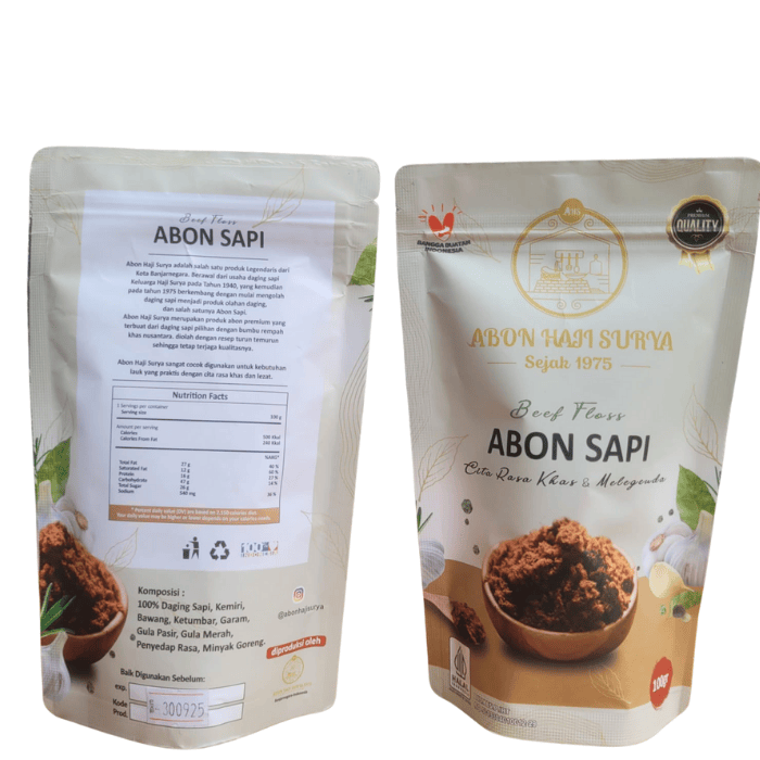 Abon Sapi Haji Surya is a premium beef abon product made from selected local beef, processed with a blend of Indonesian spices without using preservatives. The production process is carried out traditionally using firewood and human labor, as well as following the recipes inherited from generation to generation, in order to maintain the authenticity of taste.