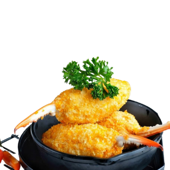 Processed crab claws meat wrapped in a breaded fish batter.