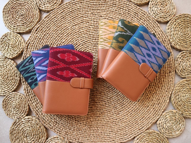 Made from ikat woven material, premium faux leather, nickel ring binder, magnetic lock.
