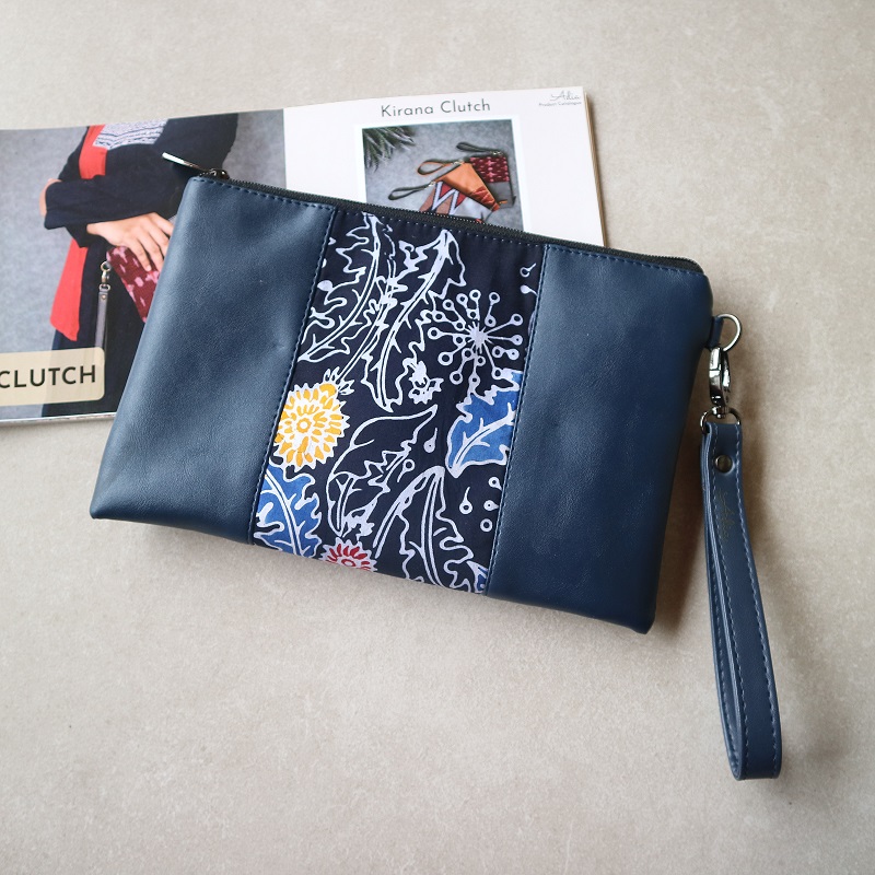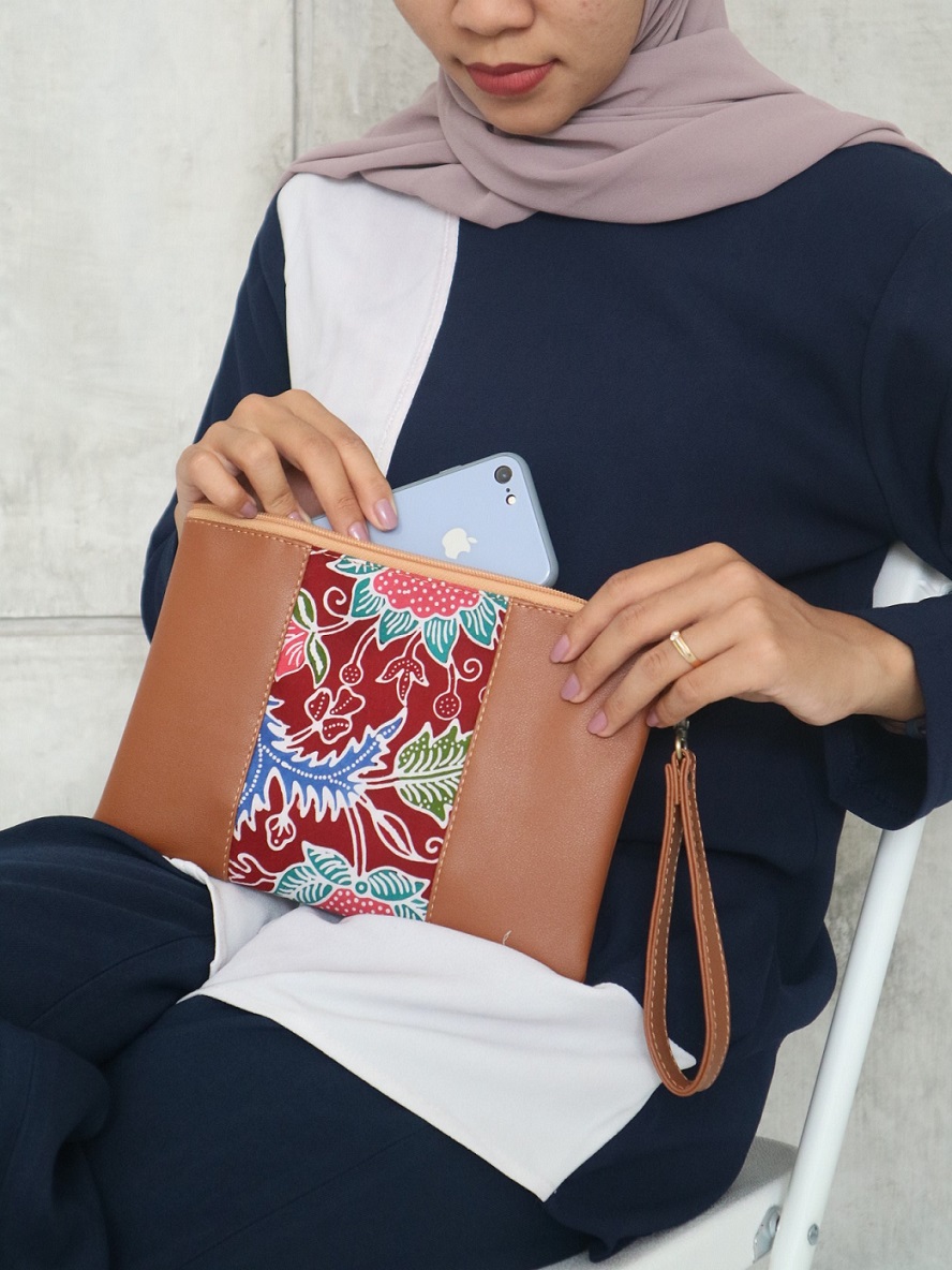 Made from ikat woven material, premium faux leather, cotton inner, black nickel accessories, zipper.