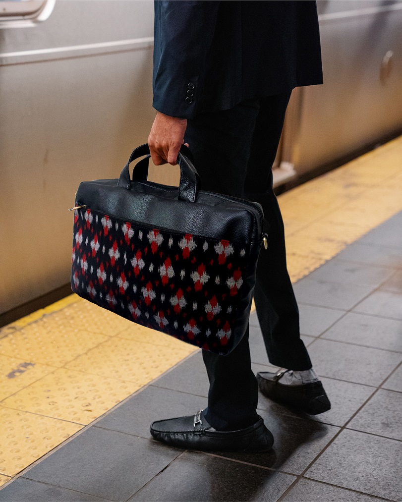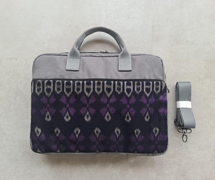 Made from ikat woven material, premium faux leather, polyester inner, black nickel accessories, zipper, polyfoam.