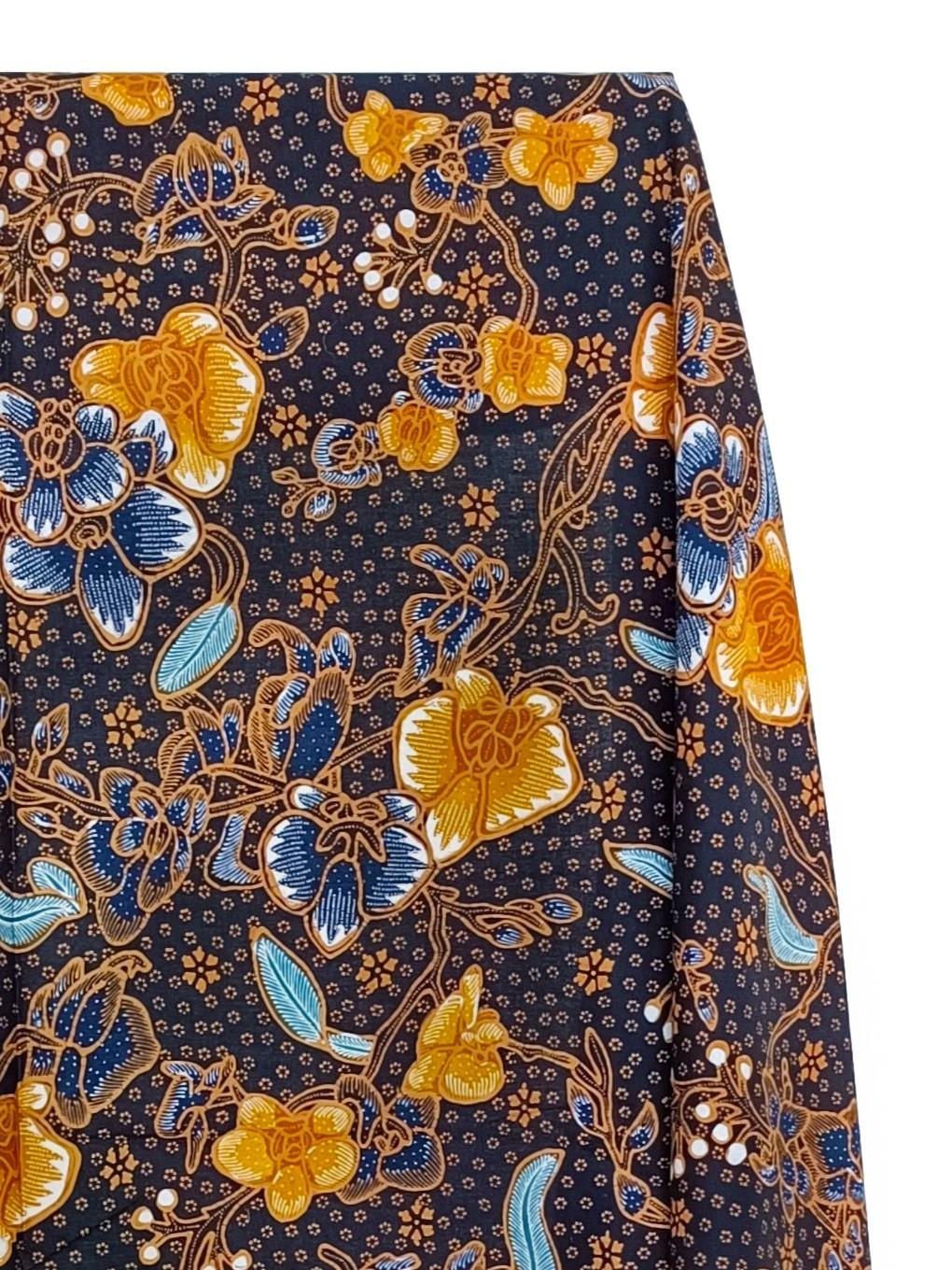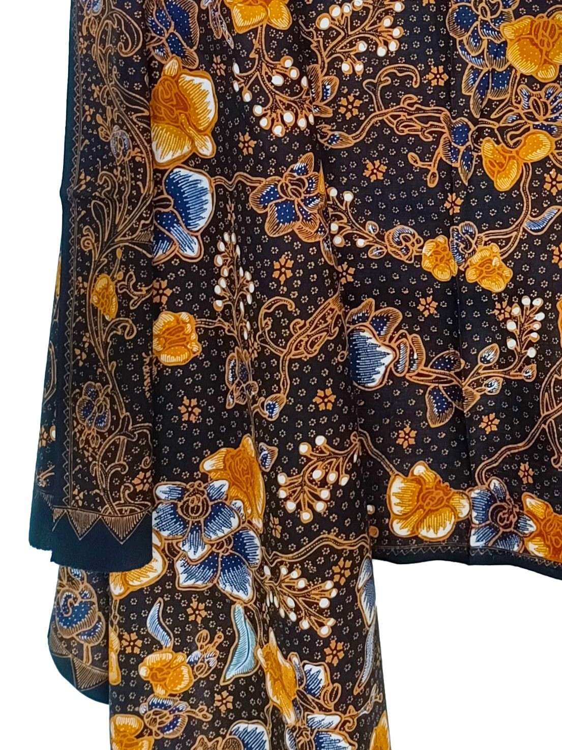 Pattern Meaning: Bunga anggrek kuning melambangkan kebahagiaan, persahabatan, dan kehangatan. Warna kuning juga melambangkan keceriaan dan optimisme, sehingga anggrek kuning sering dijadikan sebagai hadiah untuk menyampaikan pesan positif dan membangkitkan semangat. Bunga anggrek ungu melambangkan keanggunan, kemewahan, dan kekuasaan. Warna ungu juga melambangkan kebijaksanaan dan spiritualitas, sehingga anggrek ungu sering dijadikan sebagai hadiah untuk menyampaikan pesan kebijaksanaan dan rasa hormat. Sedangkan Parijoto adalah jenis tanaman/buah yang banyak ditemukan di Desa Colo, Kabupaten Kudus. Buah ini punya banyak peran bagi masyarakat, mitosnya jika ibu hamil makan buah ini, maka akan melahirkan anak yang tampan atau cantik.
