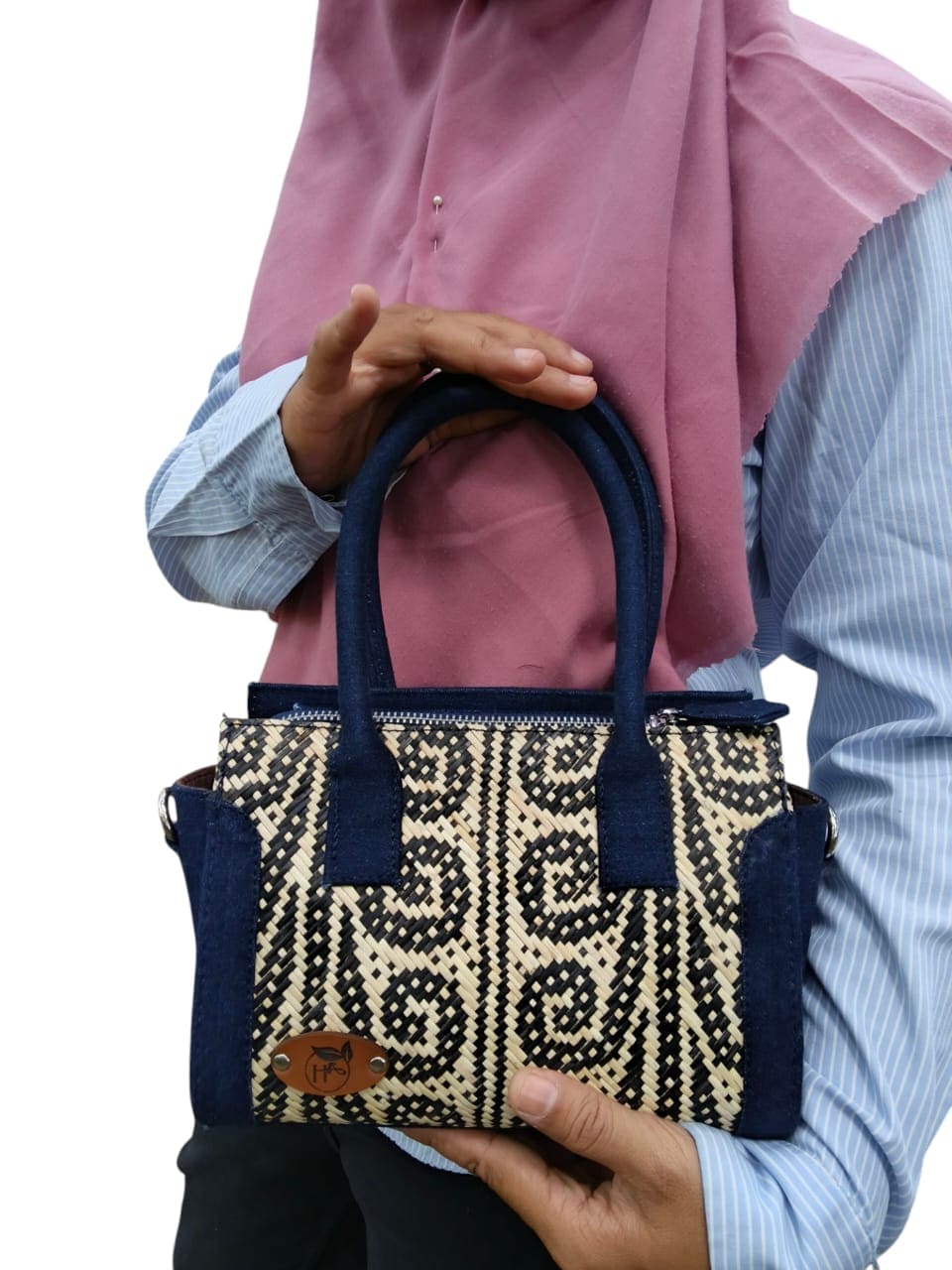 Agathis Bag comes with a mini, unique and attractive design. Its small shape but can store various personal equipment. Agathis bag can also be used to accompany formal and non-formal events, jeans material combined with rattan with various typical Central Kalimantan motifs makes this bag even more attractive. Agathis bag has three spaces, namely, one main space and two other small storage spaces. random motifs according to availability.