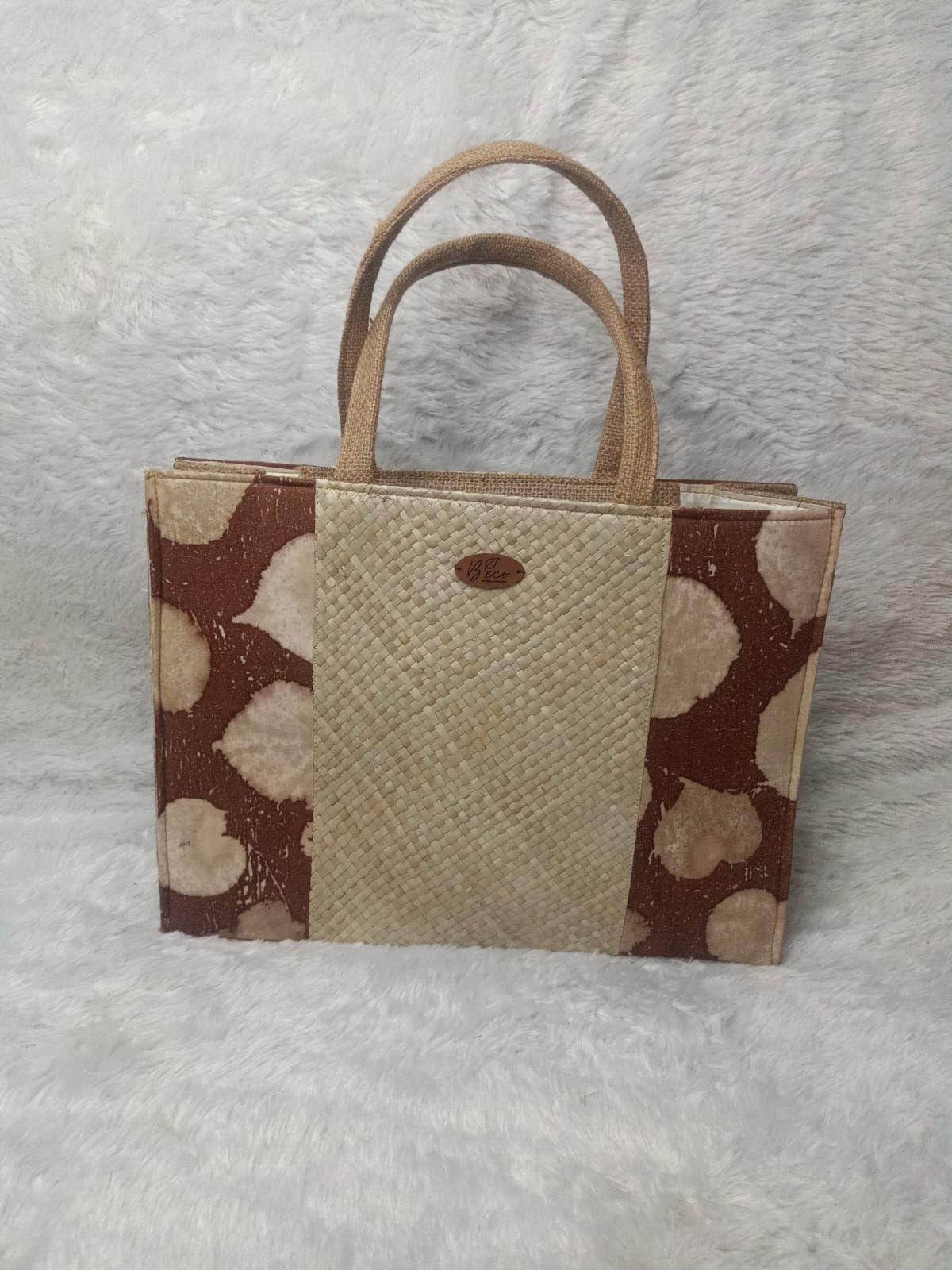 The ecoprinted cotton is reinforced with woven pandanus, giving it a traditional touch that is both beautiful and durable. Pandanus was chosen for its strength and natural texture which adds to the visual appeal of the bag. In addition, the bag also features burlap sack detailing, giving it a distinctive rustic feel and adding an organic character to the design. The design is simple yet elegant, with a large enough capacity to hold daily groceries or other necessities. This bag not only serves as a shopping aid, but also as a style statement that shows awareness of sustainability and natural beauty.