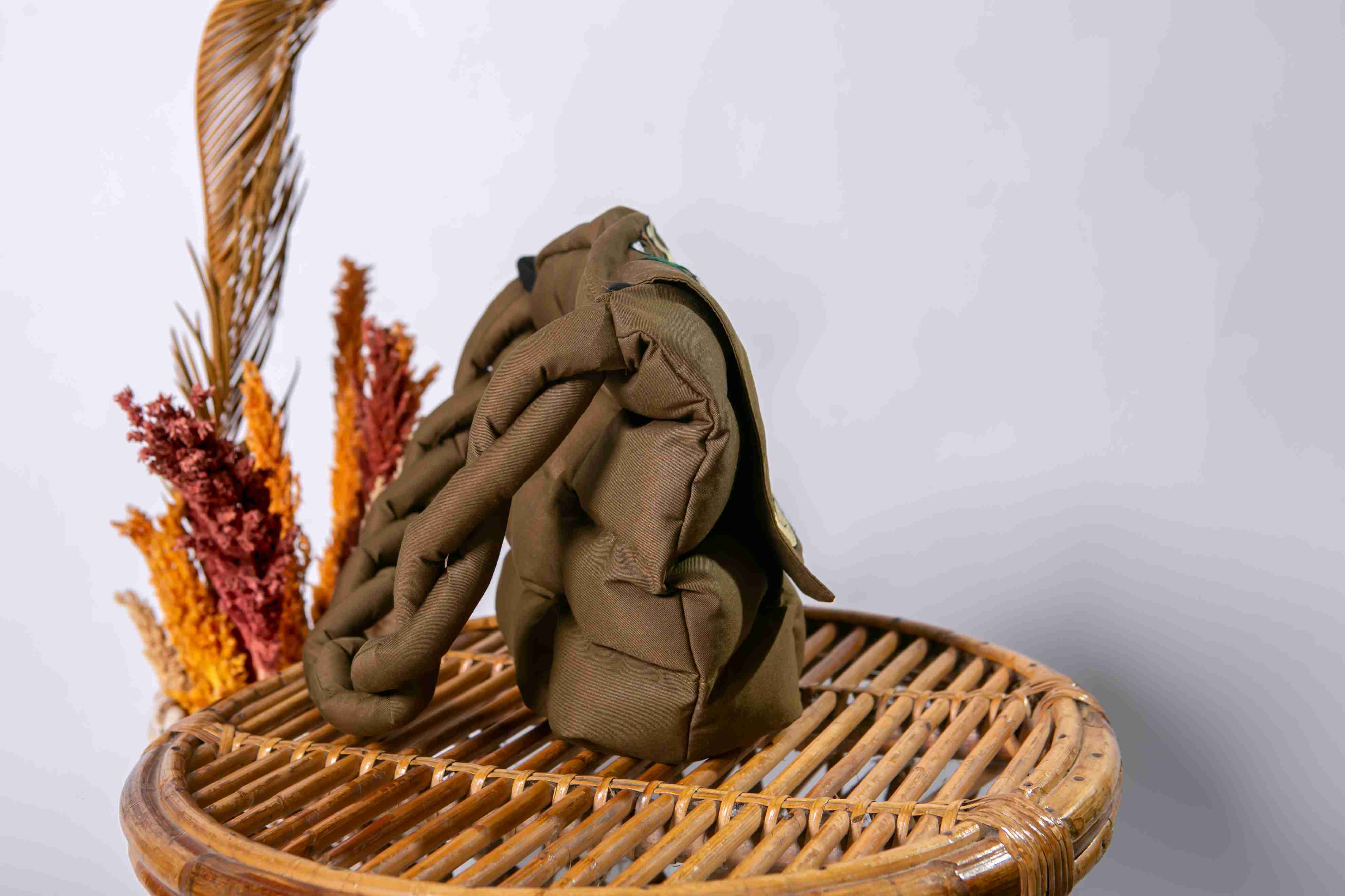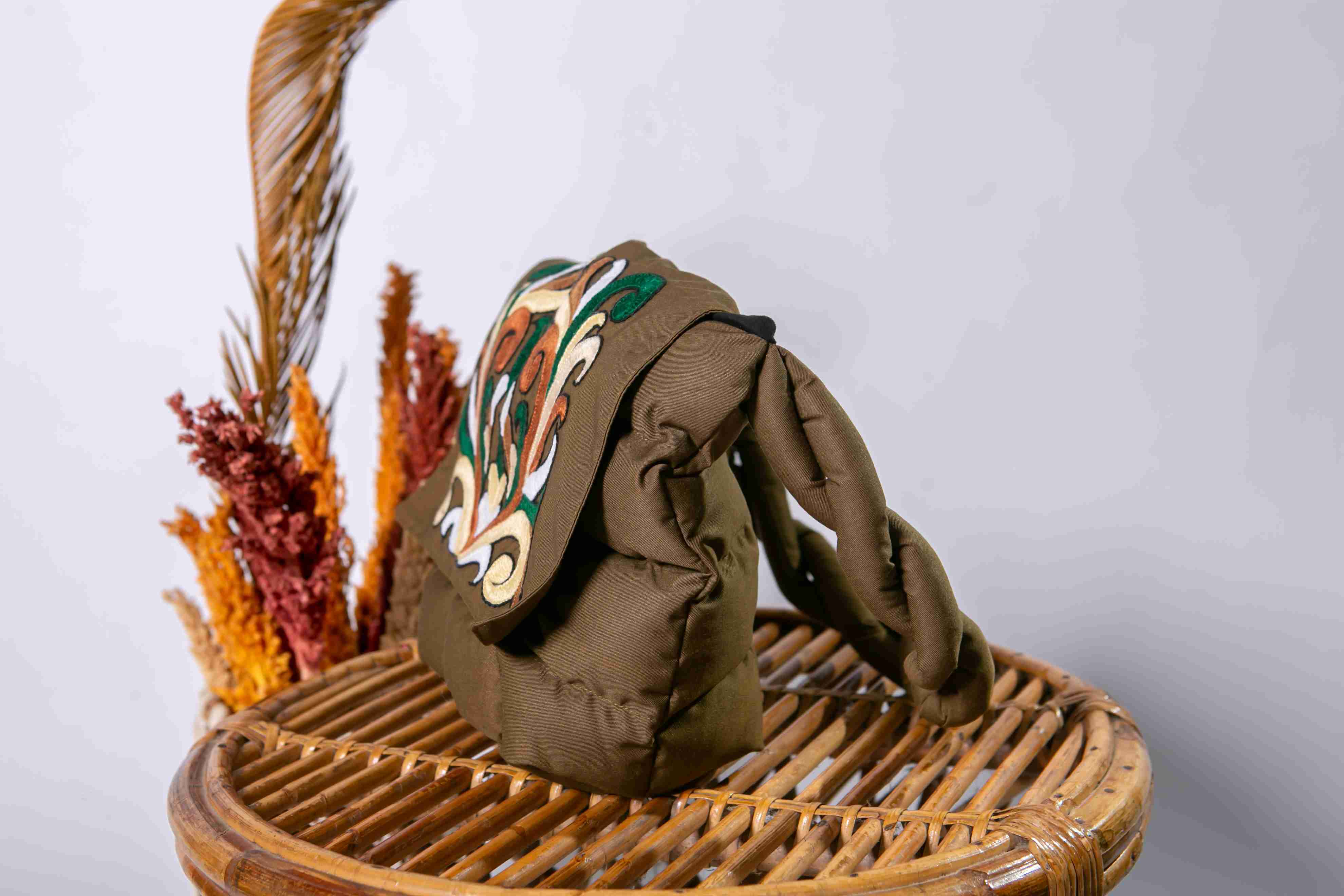 Puffy ethnic bag with Dayak motif embroidery. This bag is made of olive green fabric and features a layered design that looks soft and textured. The front of the puffy bag is adorned with beautiful embroidery showcasing symmetrical patterns typical of East Kalimantan, using shades of emerald green, lime green, ivory white, and black. The displayed motif resembles flora, reinforcing a traditional yet elegant impression. This product is suitable for use as a cosmetics bag, versatile puffy bag, or accessory for modern ethnic style.