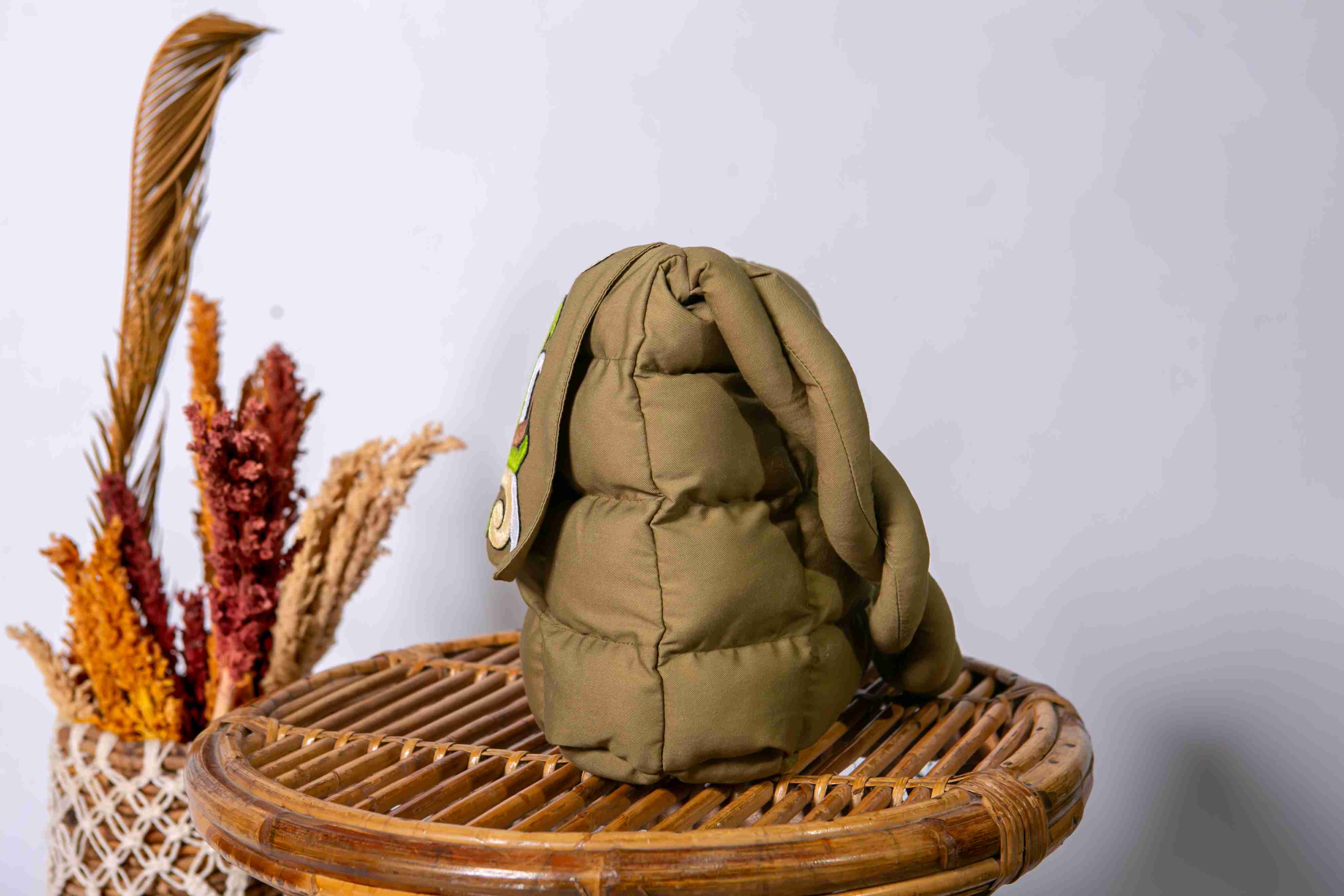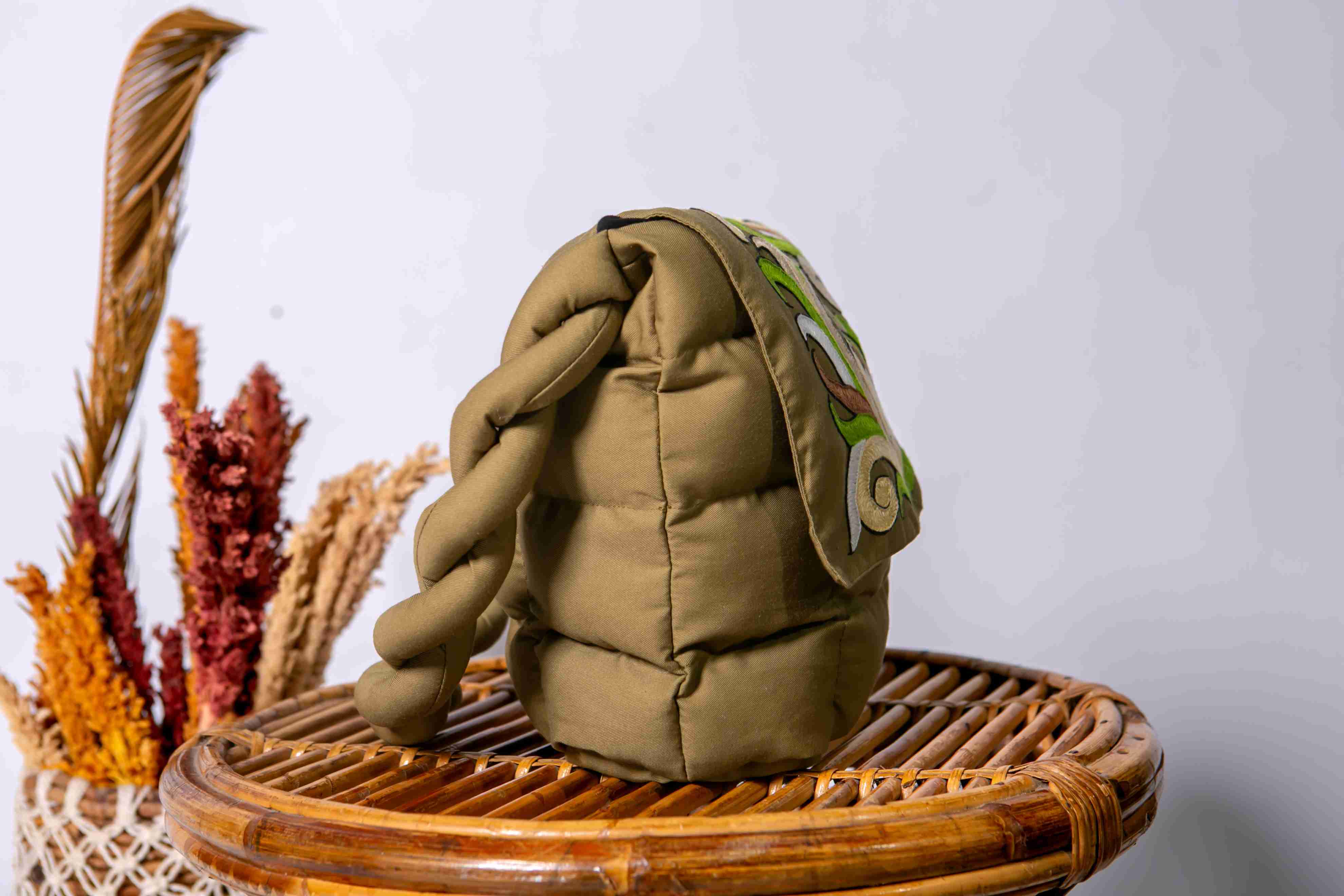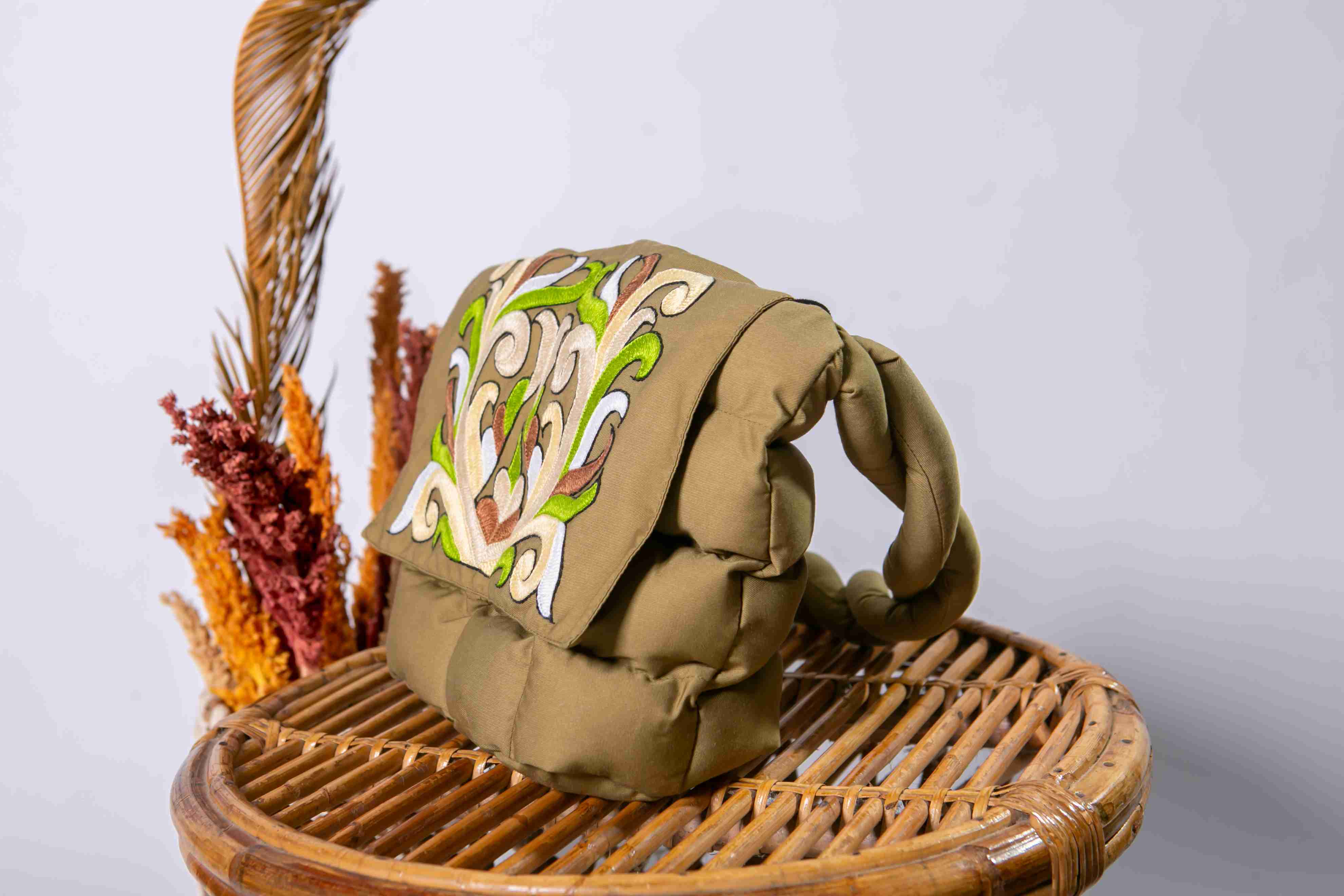Puffy ethnic bag with Dayak motif embroidery. This bag is made of olive green fabric and features a layered design that looks soft and textured. The front of the puffy bag is adorned with beautiful embroidery showcasing symmetrical patterns typical of East Kalimantan, using shades of emerald green, lime green, ivory white, and black. The displayed motif resembles flora, reinforcing a traditional yet elegant impression. This product is suitable for use as a cosmetics bag, versatile puffy bag, or accessory for modern ethnic style.