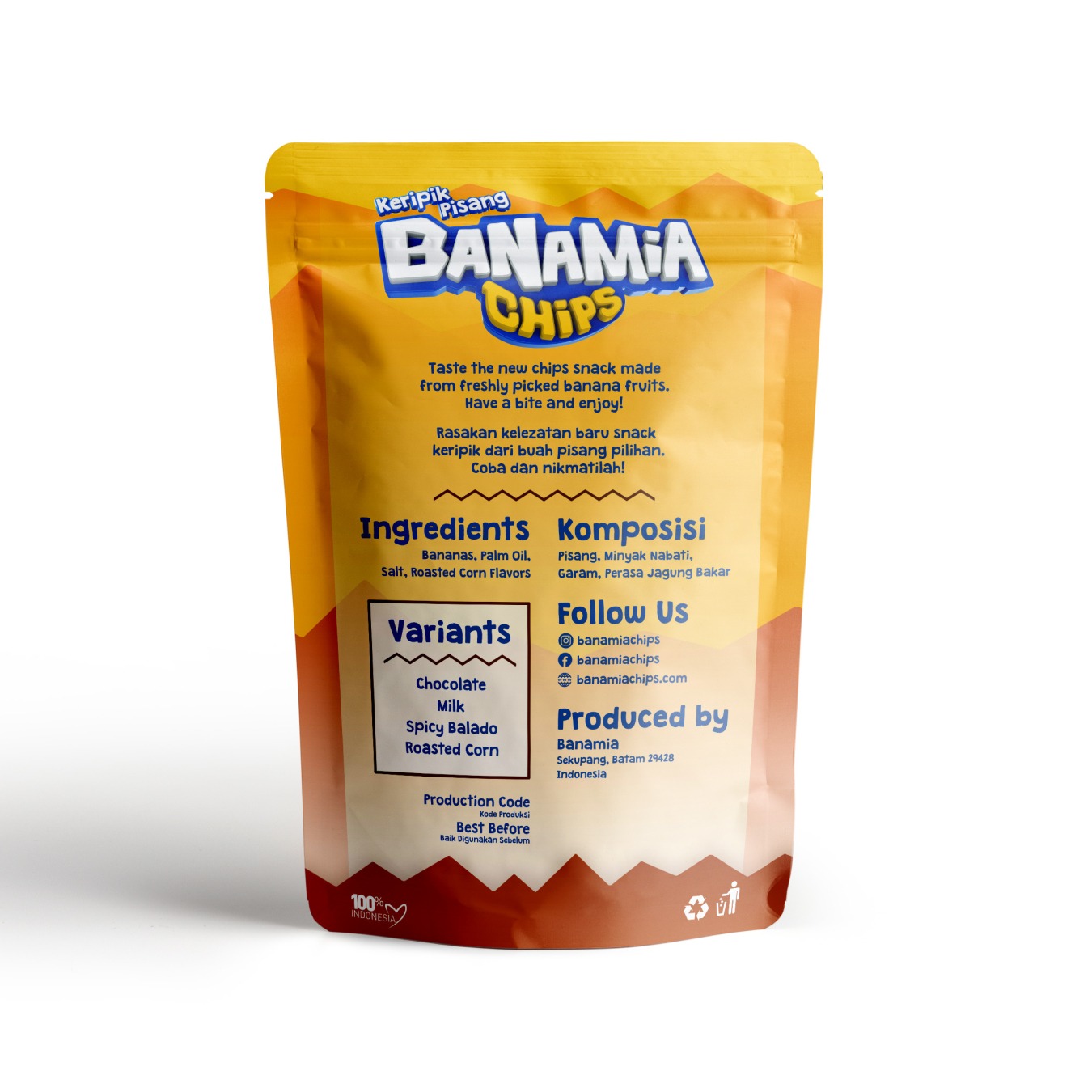 Banamia is a manufacturer of banana chips originating from the city of Batam. This business was founded with the main goal of creating healthy and delicious snack products using local ingredients. Banamia offers banana chips in a variety of unforgettable flavors, from chocolate, milk, spicy balado, to roasted corn. Banamia's banana chips are a favorite among children and the younger generation. With dedication to quality, nutrition, and sustainability, Banamia continues to develop as a producer of banana chips which is the pride of Batam City