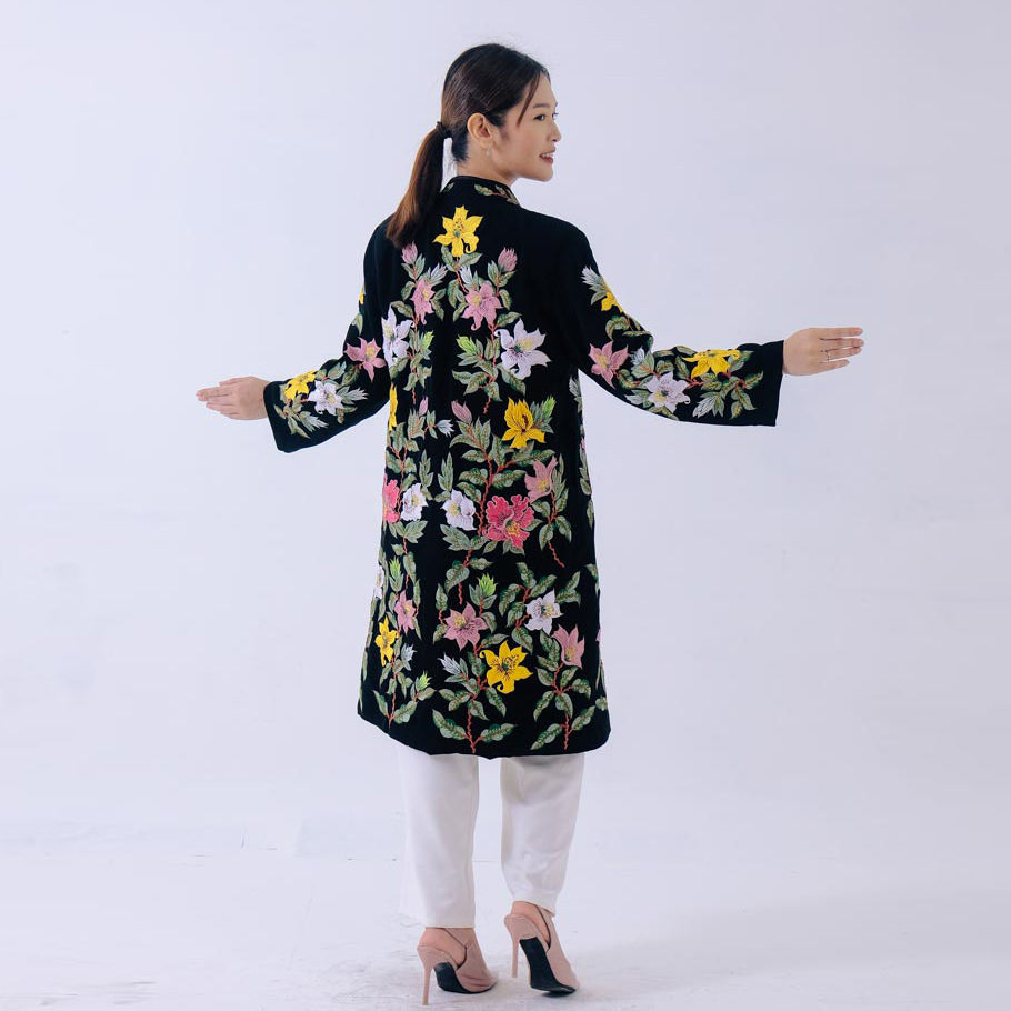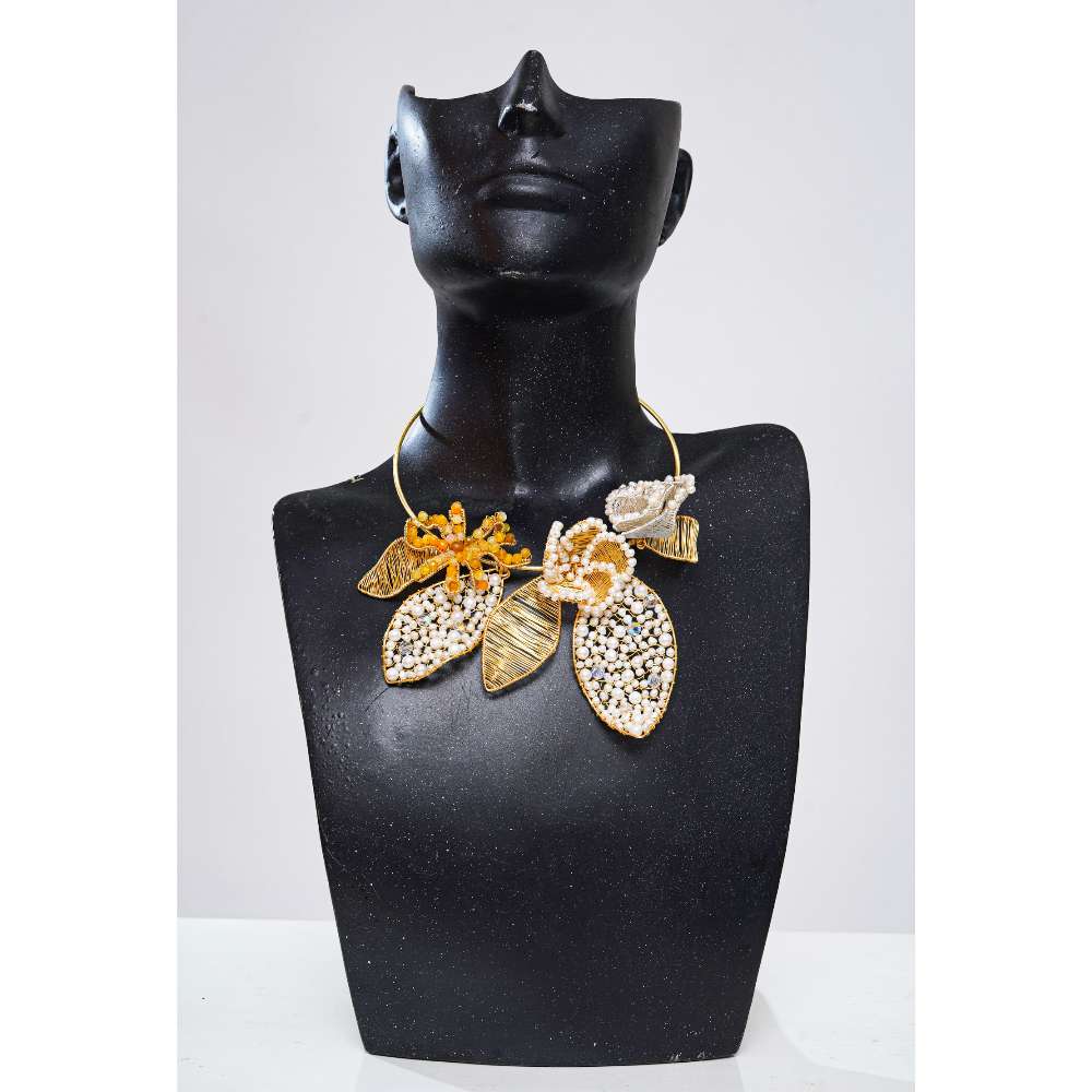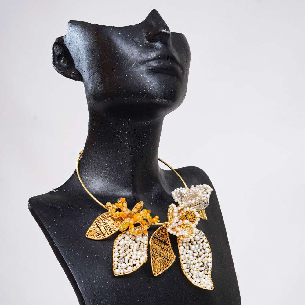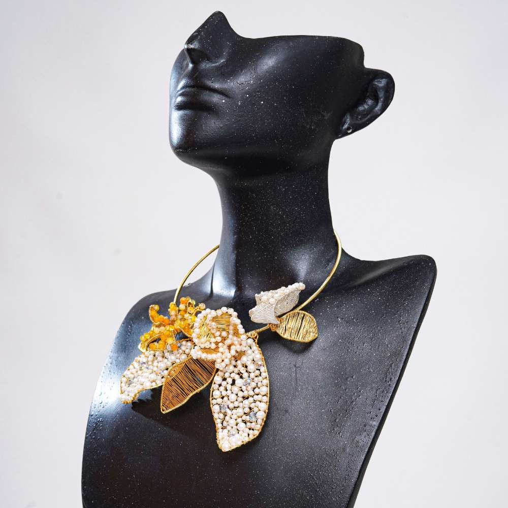 Inspired by ylang flowers, roses as a whole symbolize the beauty of the universe with white and yellow colors symbolizing a sincere and pure heart. The choker pearl necklace around the neck represents refinement and wisdom.