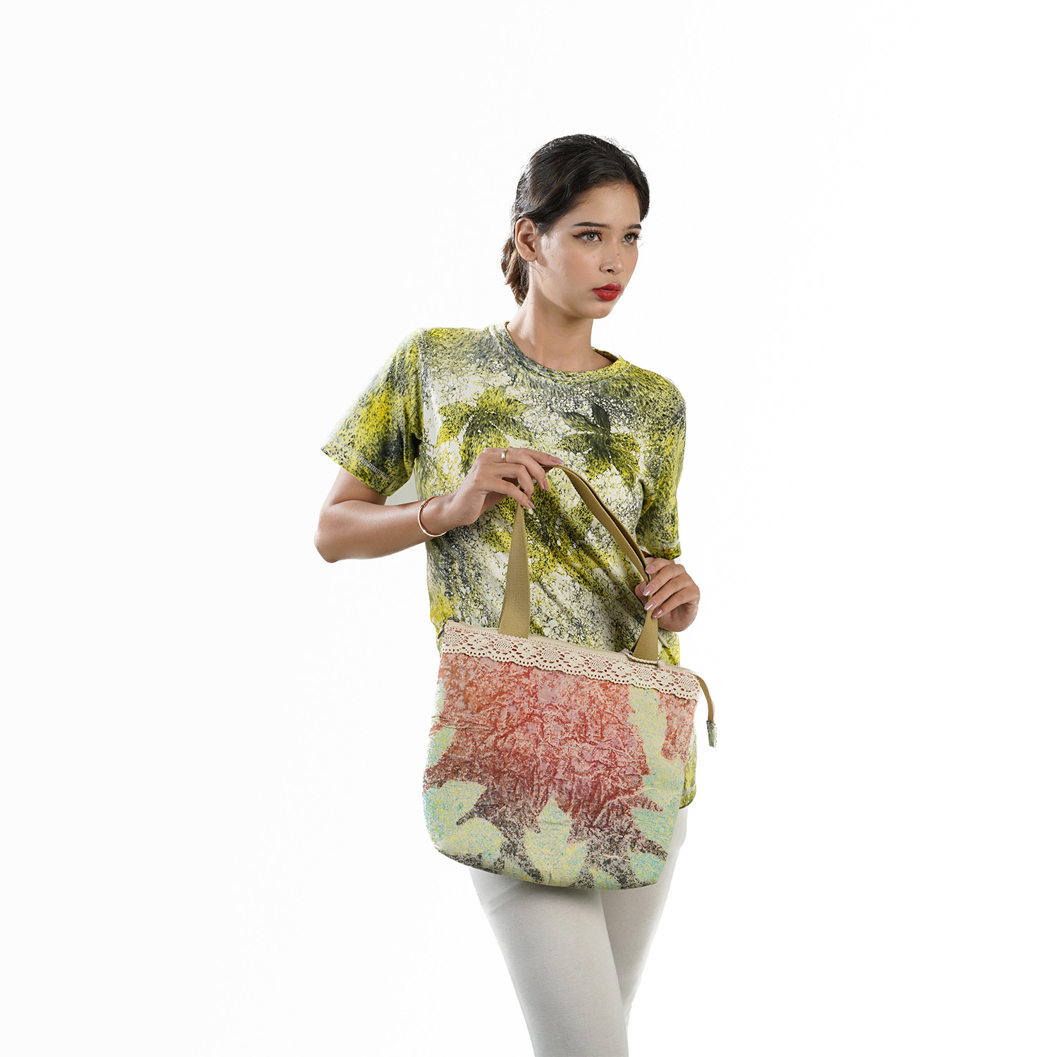 Leaf silhouette canvas bag, with splash coloring technique