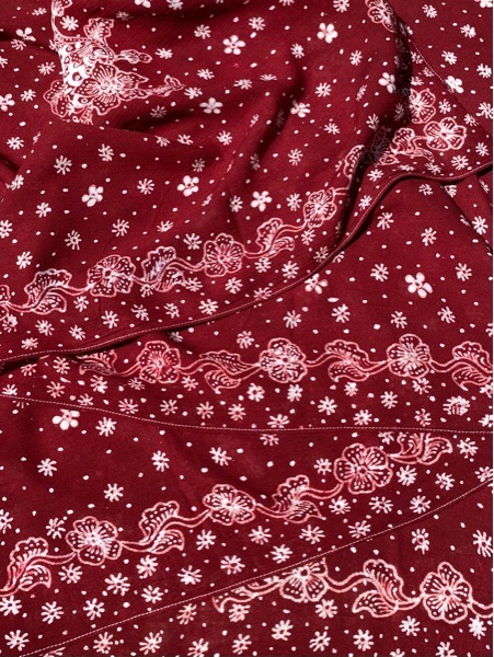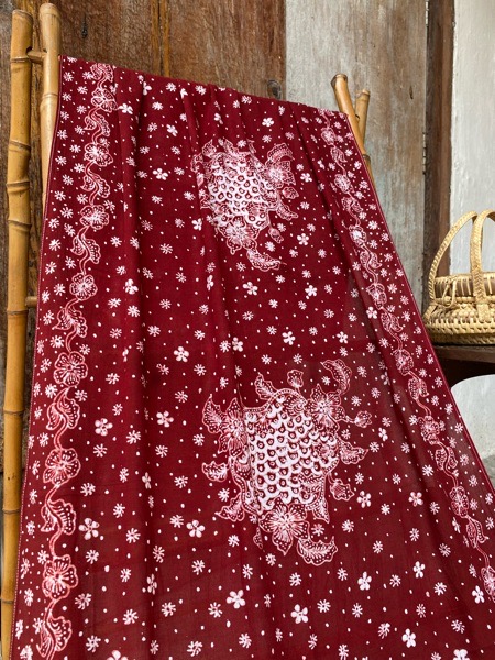 Pattern Meaning: Sekar Jagad (Bunga Bumi) berisi macam-macam flora dibumi yang melambangkan hubungan yg harmonis antara munusia dan alam. Warna merah getih pitek (merah darah ayam) adalah warna merah khas Lasem.