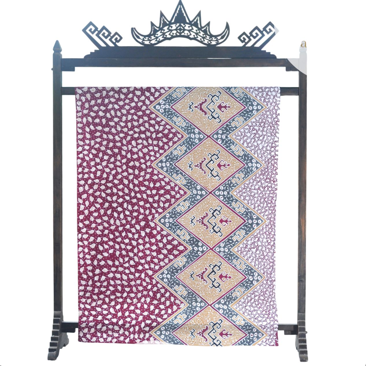Pattern Meaning: Merujuk pada bentuk belah ketupat yang dominan pada kain. "Belah" dalam konteks ini menekankan bentuk geometris yang khas. "Betuk" merujuk pada motif kompleks di dalam setiap belah ketupat yang bisa diinterpretasikan sebagai pancaran atau simbol serupa bintang, atau aneka rupa bentuk yang terbagi dalam bingkai.