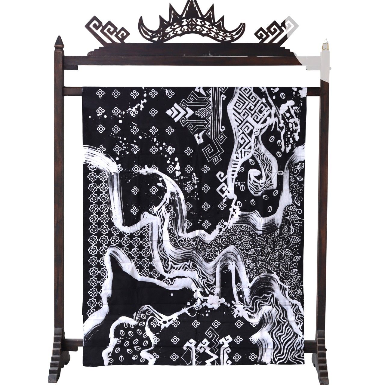 Pattern Meaning: Garis-garis abstrak dan bentuk-bentuk cair yang mengalir dan bergelombang di seluruh kain, menyerupai semburan air, ombak, atau jejak sungai.