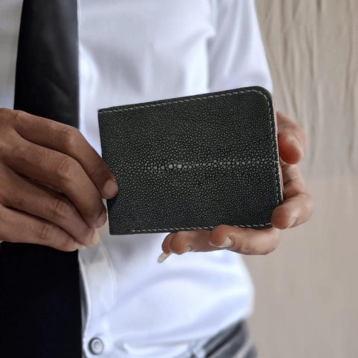 Material Type: Bagian depan atau luar memakai kulit ikan pari batu halus tekstur natural Bagian dalam mamakai kulit sapi semivegtan