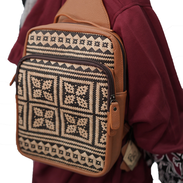 Tas anyaman berbahan rotan dan kulit sapi dengan motif khas Kalimantan Utara