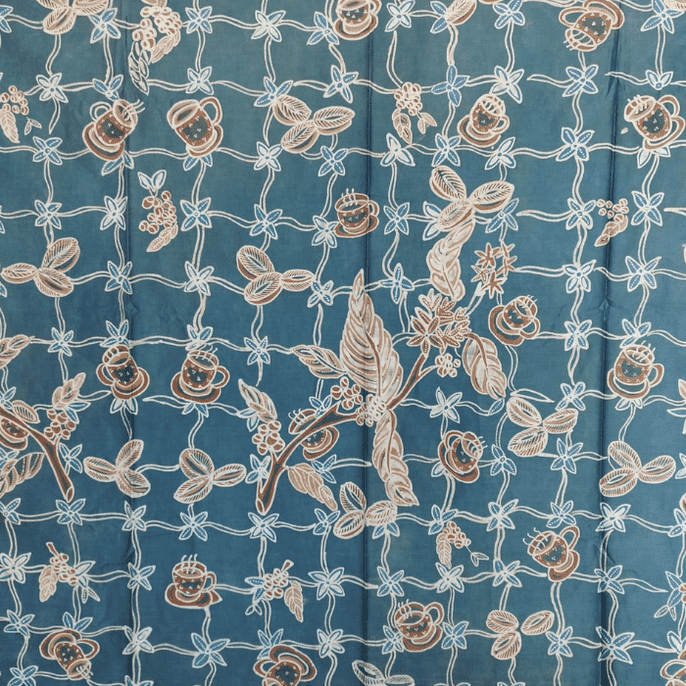 Pattern Meaning: Motif ini terinspirasi dari budaya kopi yang kuat di Belitung, yang dikenal sebagai “Negeri 1001 Warung Kopi”. Biji kopi, bunga, daun, hingga cangkir berisi kopi digambarkan dalam susunan motif yang menggambarkan kehangatan, kebersamaan, dan semangat masyarakat Belitung. Dibuat dengan teknik batik tulis menggunakan pewarna alam di atas kain katun sutra, batik ini memadukan keindahan tradisi dengan kelembutan bahan alami. Warna hijau kebiruan menghadirkan kesegaran khas alam Belitung yang menenangkan, layaknya menikmati secangkir kopi di bawah rindangnya pohon warung kampung.