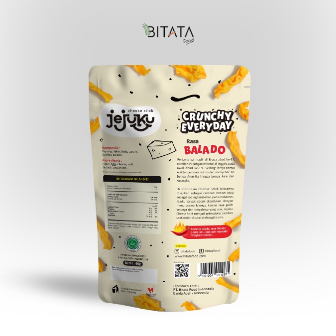 Jejuku from BitataFood is produced using a special recipe which is processed using selected quality ingredients, without harmful preservatives and flavourings, not greasy and not starchy. jejuku from BitataFood has been tested for a modern and halal production process from LPPOM MPU Aceh and the Banda Aceh City Health Office. Packaged in an attractive and exclusive package, making it easy to carry and eat anywhere, and safe for consumption by all groups.