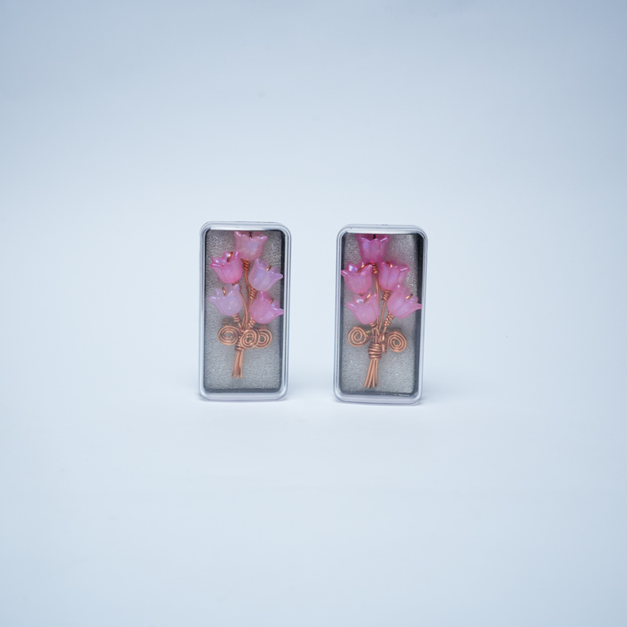 "Tulip Ceria" brings cheerful warmth through its playful and unique design. Seven tiny pastel tulips—blue, yellow, and pink—are arranged into a lovely bouquet, framed with handmade gold spiral wire. Its soft colors and charming shape make it ideal for both casual and formal looks. Perfect for teens to adults who love sweet, cheerful, and elegant style.