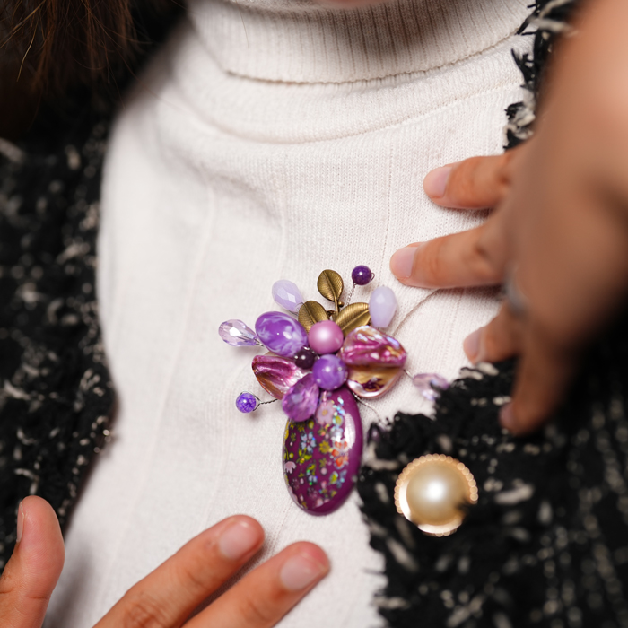 Inspired by the elegance of blooming lavender in spring, this brooch symbolizes feminine beauty and grace. Designed with purple stones, artistic floral elements, and elegant gold leaves. Perfect to enhance your daily look or special occasions. Handmade with love and care, each piece is unique and exclusive.