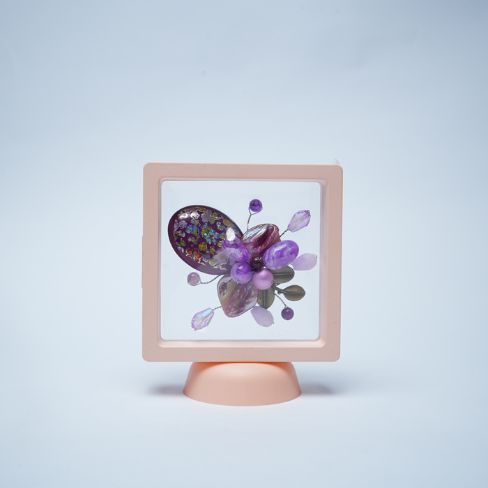Material Type: – Resin berwarna ungu dengan motif bunga lukis tangan – Manik-manik kaca dan akrilik bergradasi ungu – Ornamen daun metalik berlapis emas – Kawat stainless steel – Peniti logam anti karat