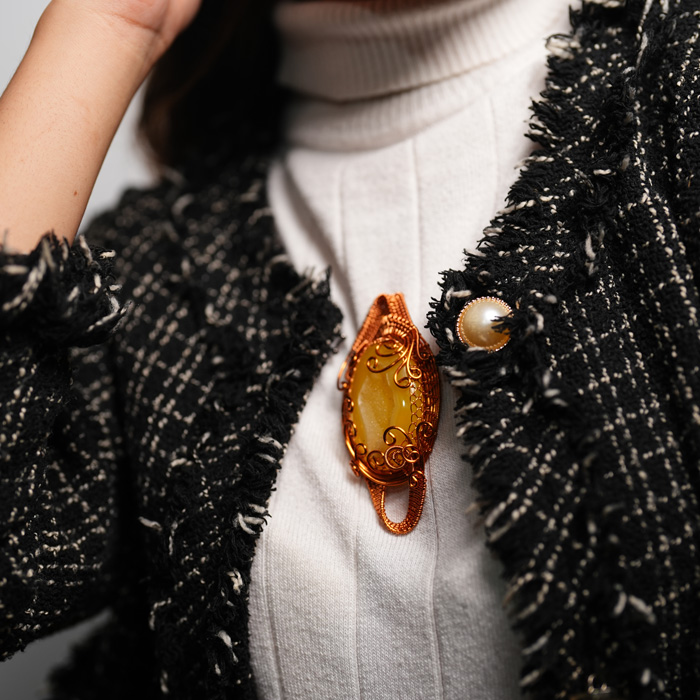 "Golden Ember" blends classic elegance with warm sophistication. A golden-yellow centerpiece glows like a calm ember, framed with copper wire and intricate swirl details. Handmade with care and precision, this brooch embodies strength and beauty. Perfect to pair with kebaya, ethnic attire, or modern outfits for a refined, standout look.