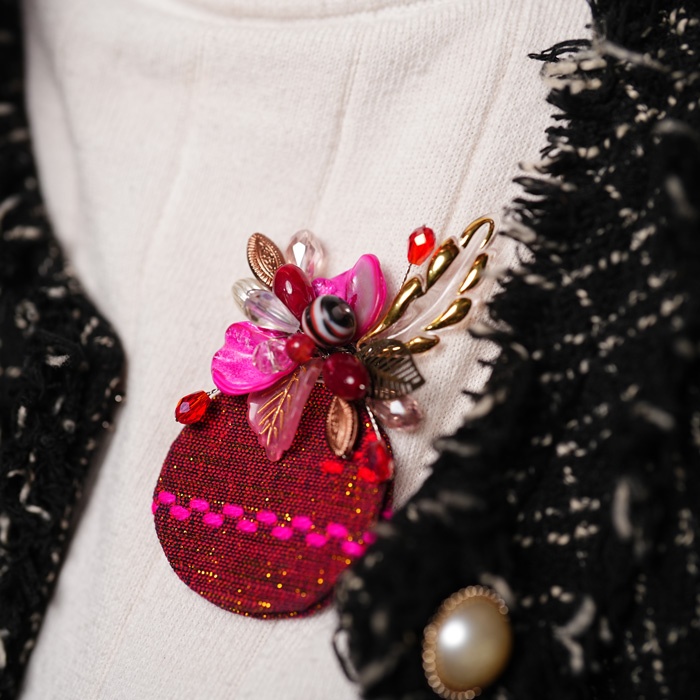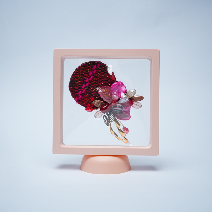 Material Type: – Kain ulos tradisional – Manik-manik batu alam dan akrilik warna merah, pink, dan ungu – Ornamen daun logam warna emas dan perunggu – Dasar bros dari kain, busa padat, dan peniti logam antikarat