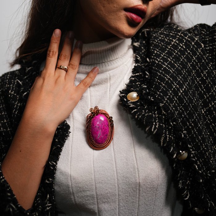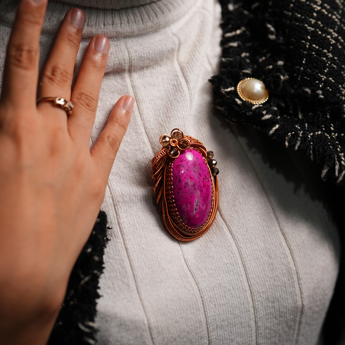 "Ruby Blossom" is a fusion of strength and elegance in one artistic piece. A vivid ruby-red stone takes center stage, wrapped in intricate copper wirework. A floral accent with smoky brown crystal adds a charming feminine touch. Perfect for formal events, parties, or as a daily statement piece. Handmade with wire wrapping technique, each brooch is unique and full of character.