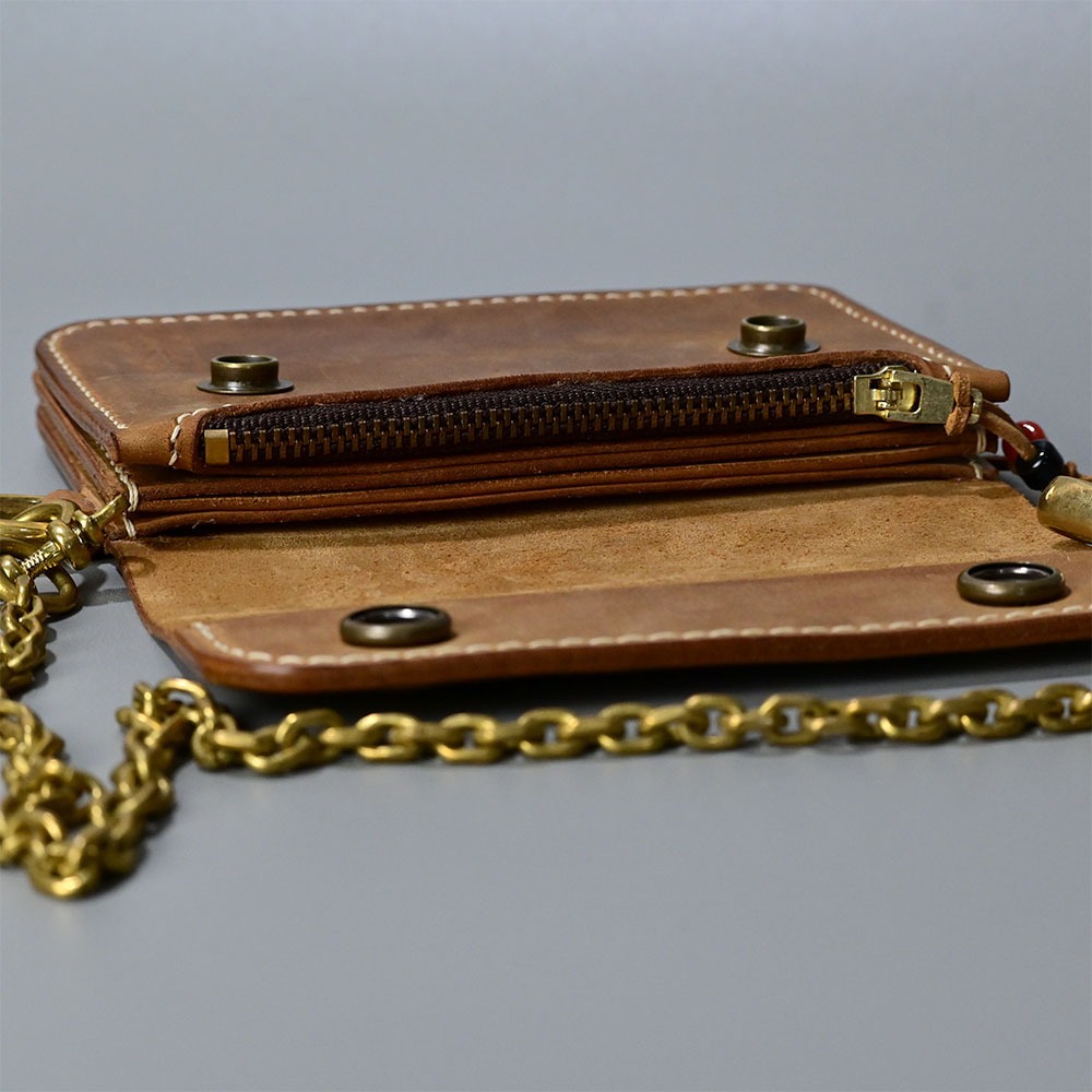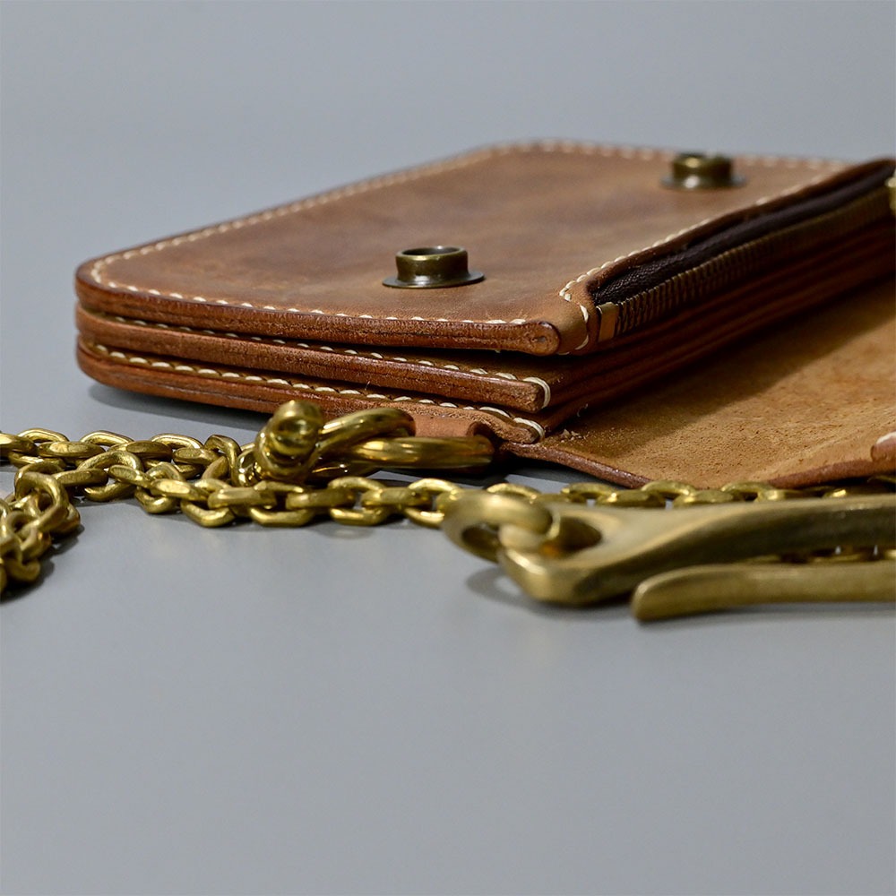 This wallet is made with crazy horse vegetable tanned leather, a simple wallet to use for you with chain accessories from genuine brass. Made by hand, from cutting to sewing.