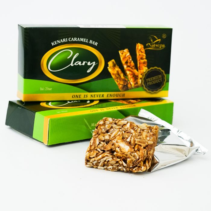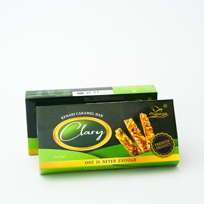 CLARY features coffee-flavored walnuts, baked into delicious 'KENARI CARAMEL SQUARES.' Each box contains two single packs.