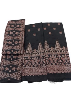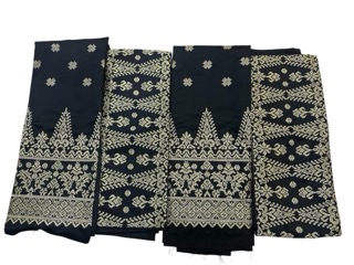 Pattern Meaning: Motif Pucuk Rebung Rebuno merupakan pengembangan dari motif tradisional Melayu Riau yang sarat akan makna filosofi dan nilai budaya. Motif ini mengambil bentuk dasar dari pucuk rebung—tunas bambu yang sedang tumbuh—yang melambangkan pertumbuhan, harapan, dan kemajuan generasi muda. Dalam versi Rebuno, bentuk pucuk rebung dimodifikasi menjadi lebih ramping, berlapis-lapis, dan elegan, menyerupai siluet menara atau jalinan sulur tumbuhan. Motif ini dibordir di atas kain dengan pola tenun Riau, memberikan dimensi visual dan tekstur yang kaya. Sentuhan tenun pada bordir menciptakan kesan eksklusif dan mewah, namun tetap menjaga akar budaya lokal.