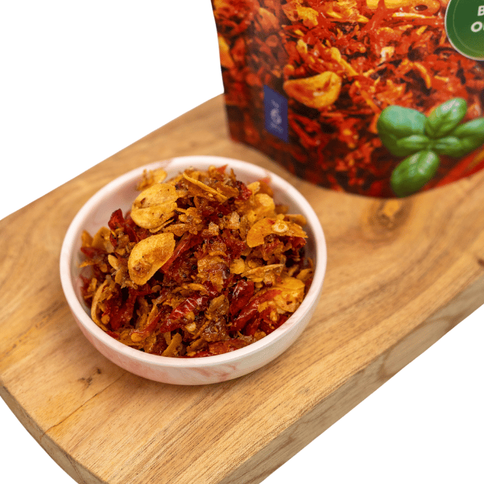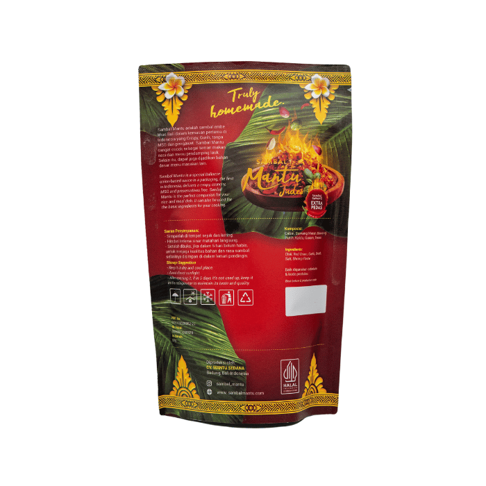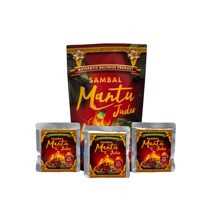 Sambal Mantu Original Pouch Saset Variant has extra spicy level with 6 sachets. Sambal Mantu is a typical Balinese “Mbe” or onion chili sauce that is SAFFY, CRISPY, WITHOUT MSG.