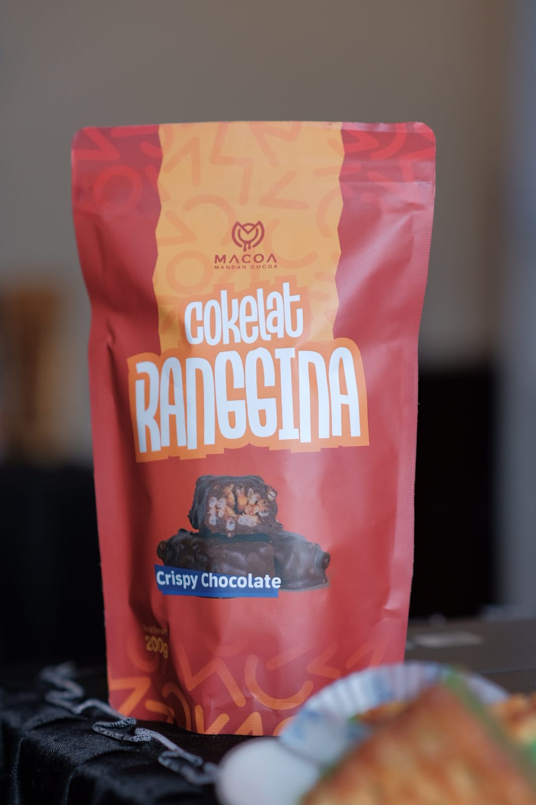 Ranggina chocolate is made from ranggina covered with a layer of macoa milk chocoate is made from cocoa powder, vegetable fat, sugar and milk.