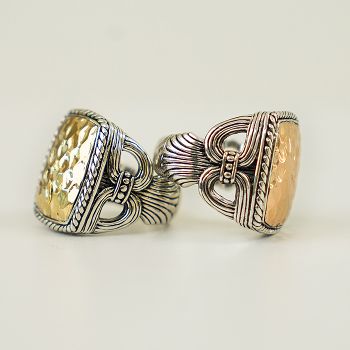 This design was inspired by a bundle of rope tied that was hit by the waves and irradiated by the sun so that an eroded texture was formed. The beauty of this ring also can be seen clearly from the front view which is decorated with 18k Hammer Rose Gold.