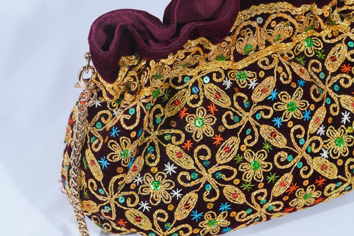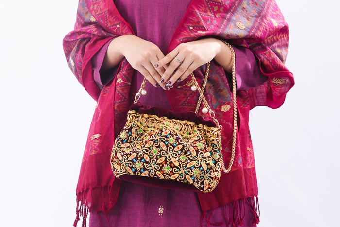 Mutiara clutch angkinan pearl clutch is made from a velvet suede inner material with an angkinan outer that is embroidered using gold thread with additional sequins and has been equipped with a premium rose gold long chain.