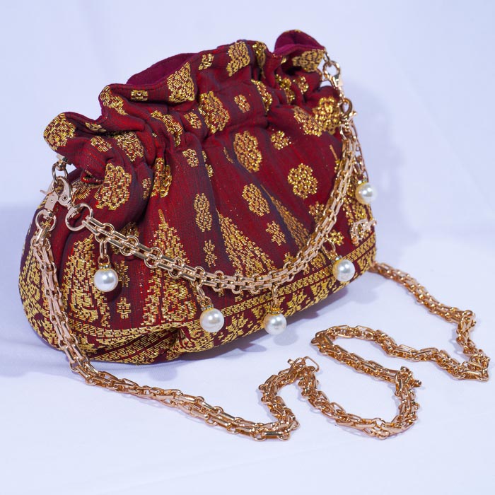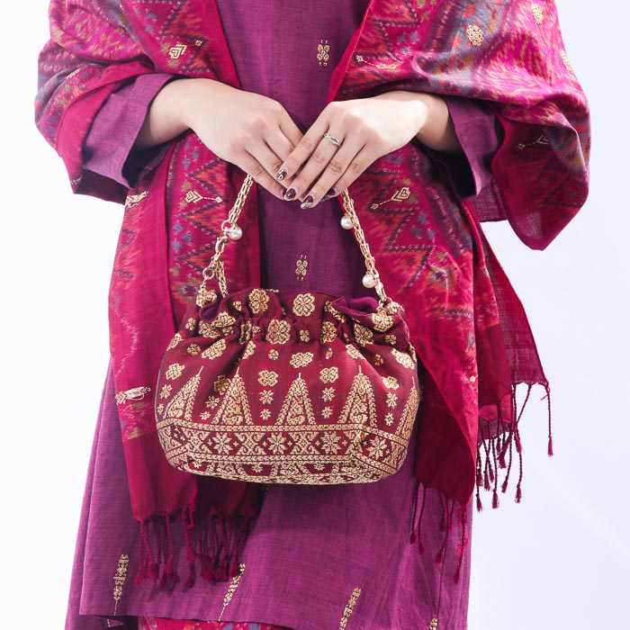 Pearl clutch made from Palembang songket weaving, with premium velvet inner material, premium rose gold chain accessories.
