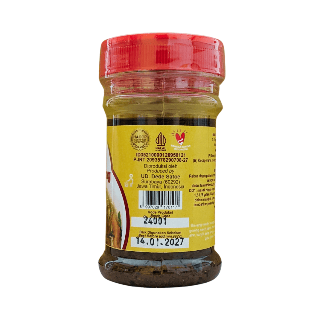 Material Content: Bawang merah, bawang putih, minyak nabati, kemiri, ketumbar, jahe, kunyit, merica, sereh, lengkuas, daun jeruk purut, jinten