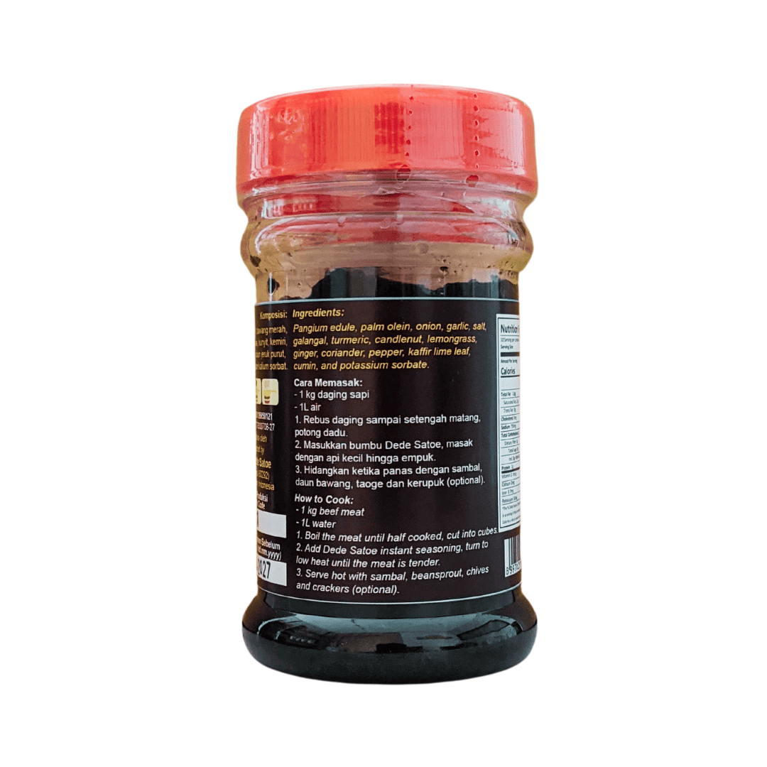 Material Content: cabai, keluwak, garam, laos, bawang putih, bawang merah, kunyit, ketumbar, serai, jinten, daun jeruk purut, kemiri, minyak nabati
