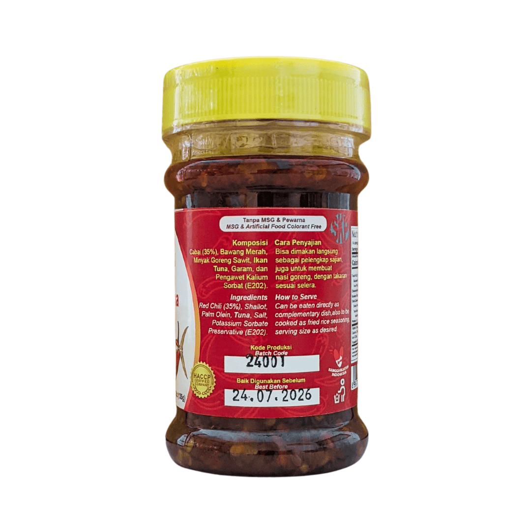 Material Content: Cabai, bawang merah, bawang putih, garam, minyak goreng sawit, tuna
