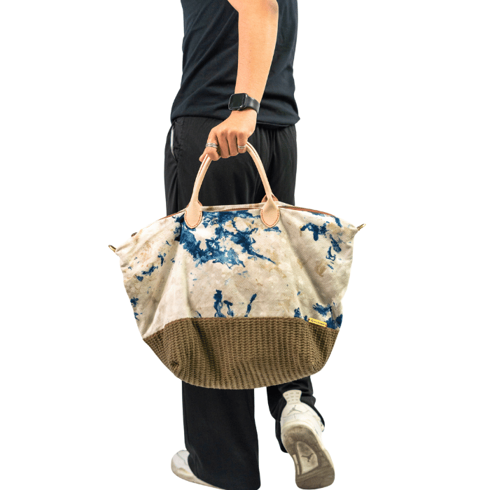 Versatile tote bag made from natural dyed fabric with undyed cowhide strap so it has a natural impression