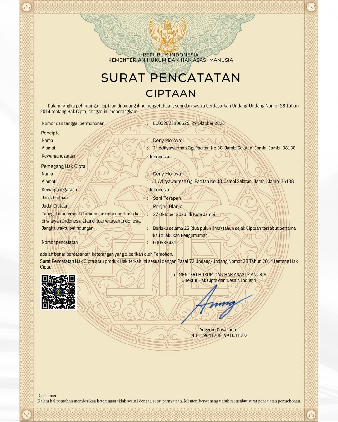 D’moroy is a woven craft brand using natural fibers sourced locally from Jambi. Founded in 2018 by Deny Moroyati, it began as a creative idea and later focused on developing woven products based on Jambi’s cultural heritage and local materials, including traditional weaving techniques. The business obtained its first micro and small enterprise license on November 18, 2019, in South Jambi District, and was updated to an integrated business license under the OSS system with a Business Identification Number (NIB) on February 2, 2021.