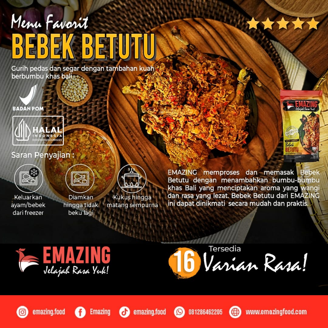 EMAZING processes and cooks Betutu Duck with adding the typical Balinese seasoning creating a fragrant and delicious aroma. Betutu Duck from EMAZING can be enjoyed easily and practically.