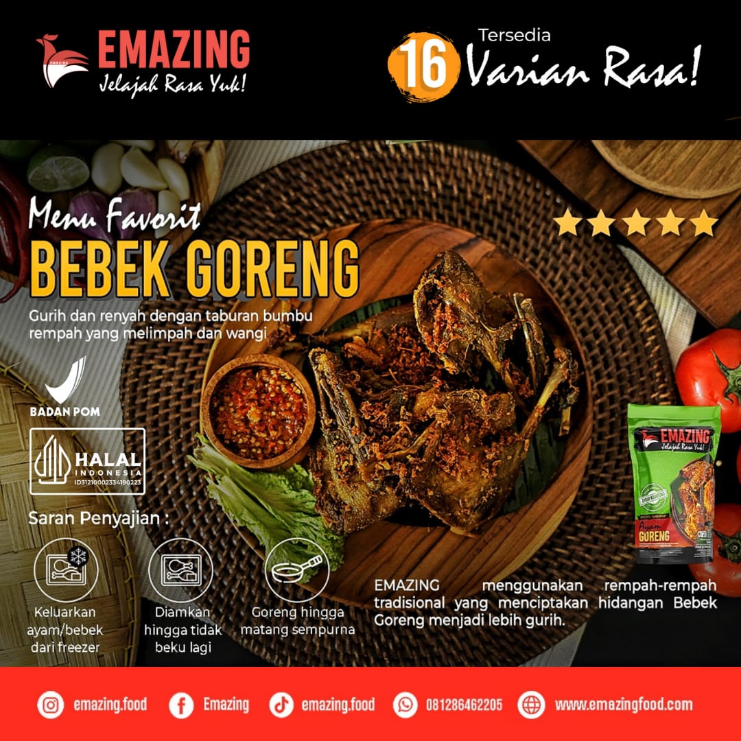 EMAZING is an Indonesian original brand product in the food sector or a special culinary which mixes various Indonesian spices with distinguish flavors and properties with Trade Mark Registered Number IDM001088008. Involving diverse professional cooks, who have explored culinary delights in every corner of the region, EMAZING products have a genuinely authentic taste, while still presenting regional specialties in Indonesia. EMAZING presents a highly distinctive taste of the Archipelago. It starts from practical packaging to a simply easy processing for anyone who wants to serve a meal at home and present as a gift for the beloved ones.