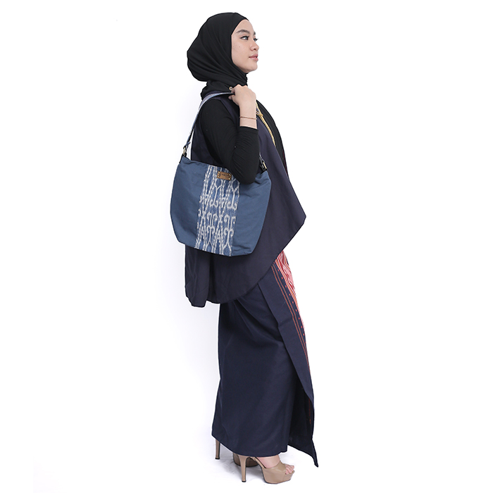 Simple handbag made of blue canvas plus pieces of ikat woven fabric, great for traveling.