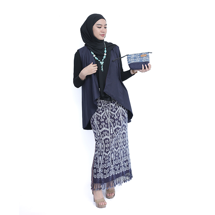 Simple pouch made of blue suede utilizing leftover pieces of ikat weaving fabric for shirt patterns, simple to use