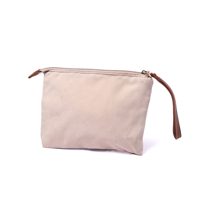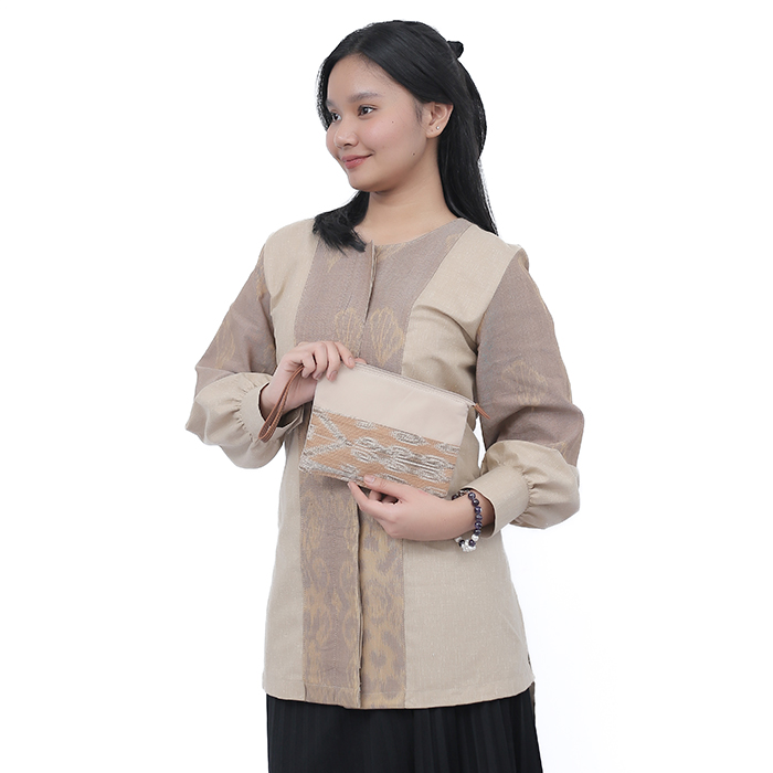 Simple pouch made of cream suede utilizing leftover pieces of ikat weaving fabric for shirt patterns, simple to use