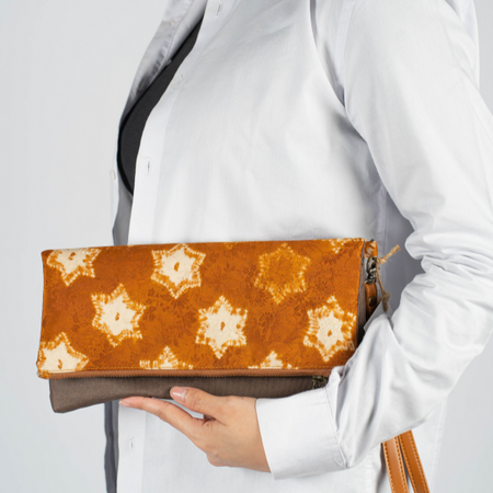 Material Type: kain jumputan pewarna alami dan kulit sintetis