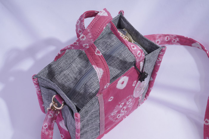 Sling bag made of semi-canvas kagawa fabric combined with tie-dye fabric.