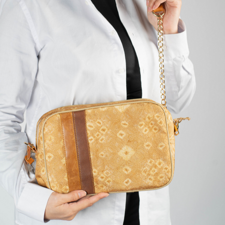 Tas ini terbuat dari Kain jumputan pewarna alam dan kulit sapi